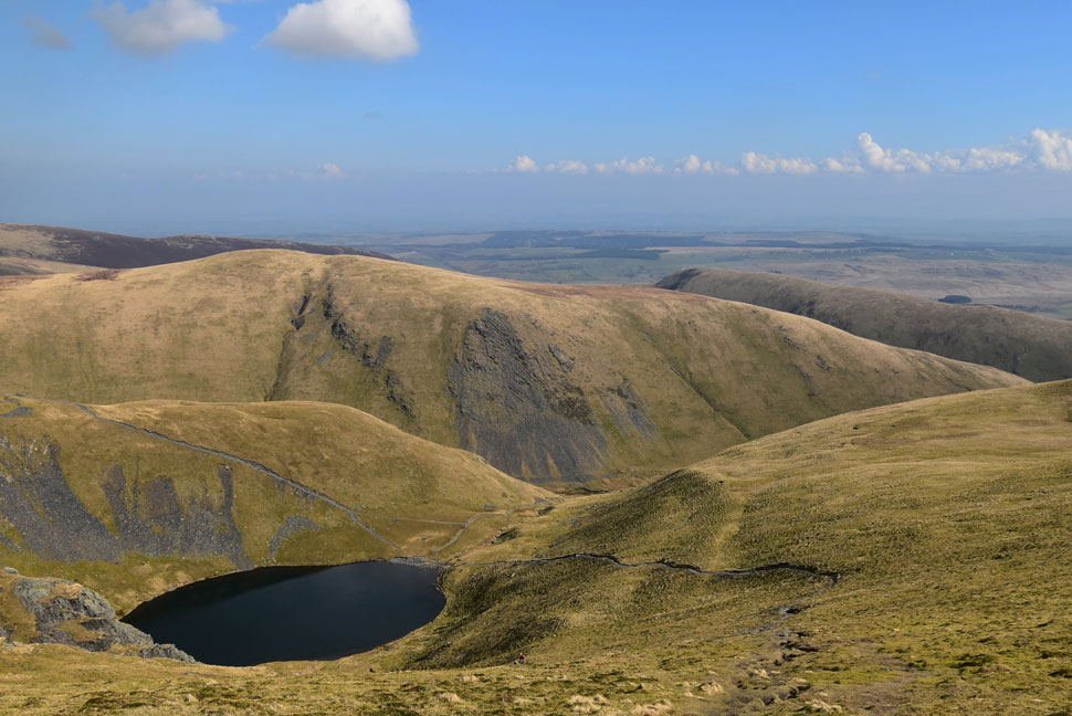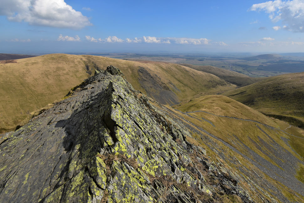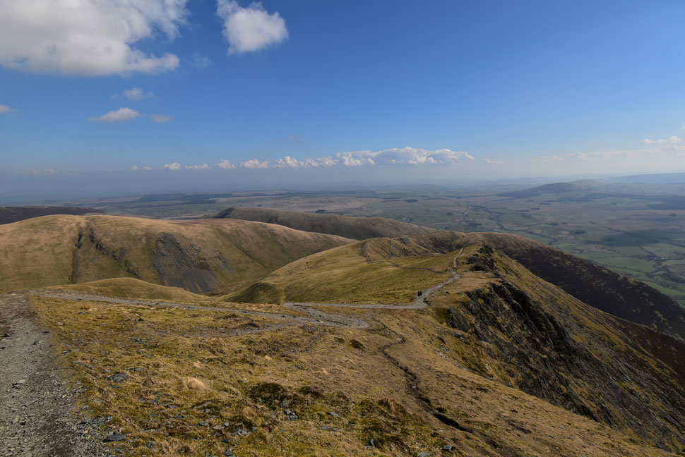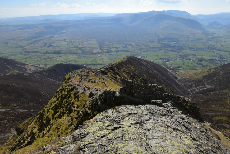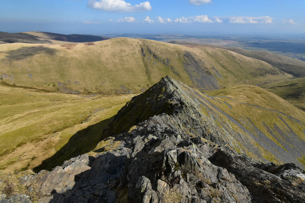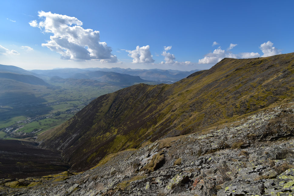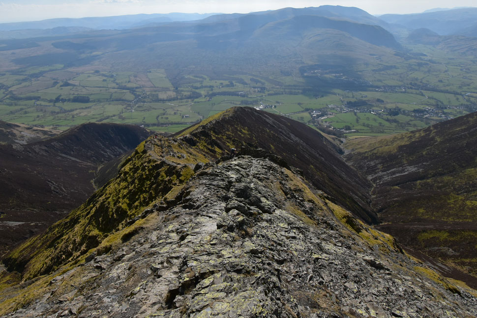 That's the Doddick Ridge which isn't as exhilarating as the Hall's Fell Ridge but still a classic ascent non the less. Scale Fell can be seen beyond with the Mell Fells almost lost in the haze in the far distance. |