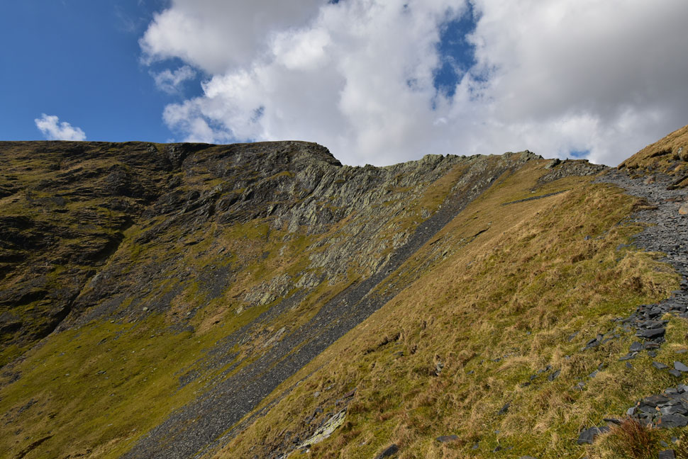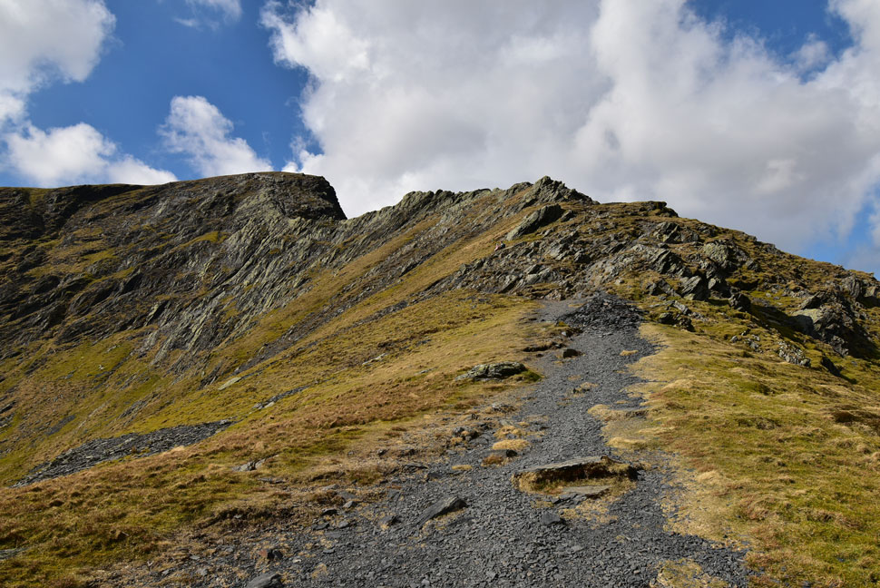I could have walked along the Saddle to reach the top of the path seen left but instead I descend the familiar zigzags then cut across from the bottom. |