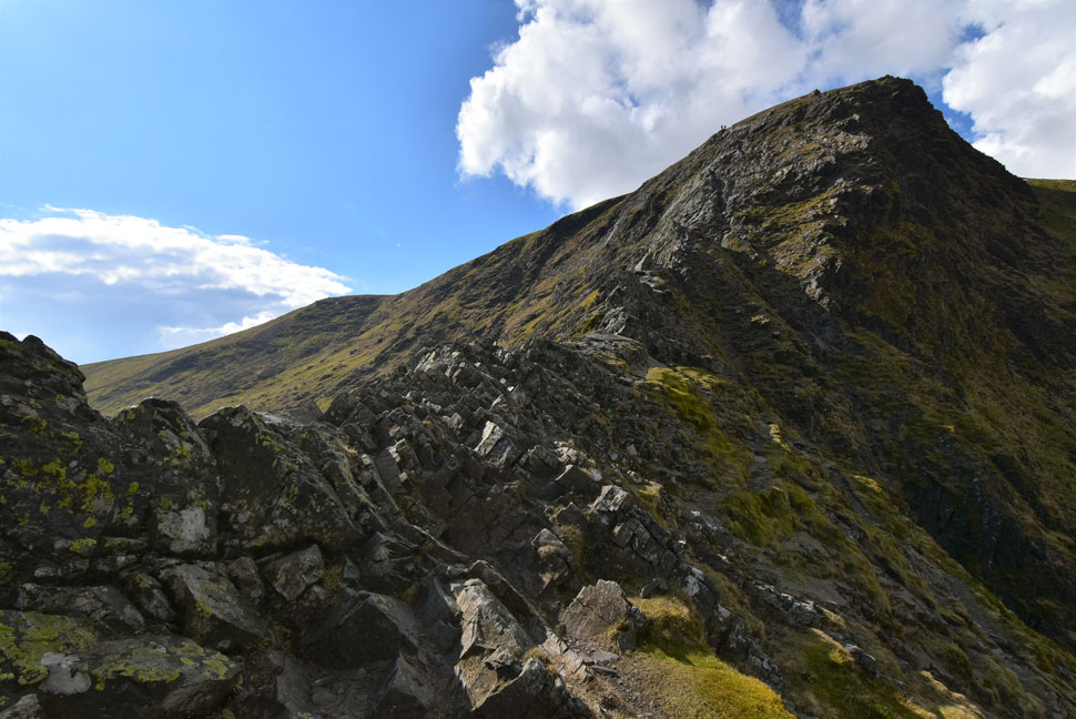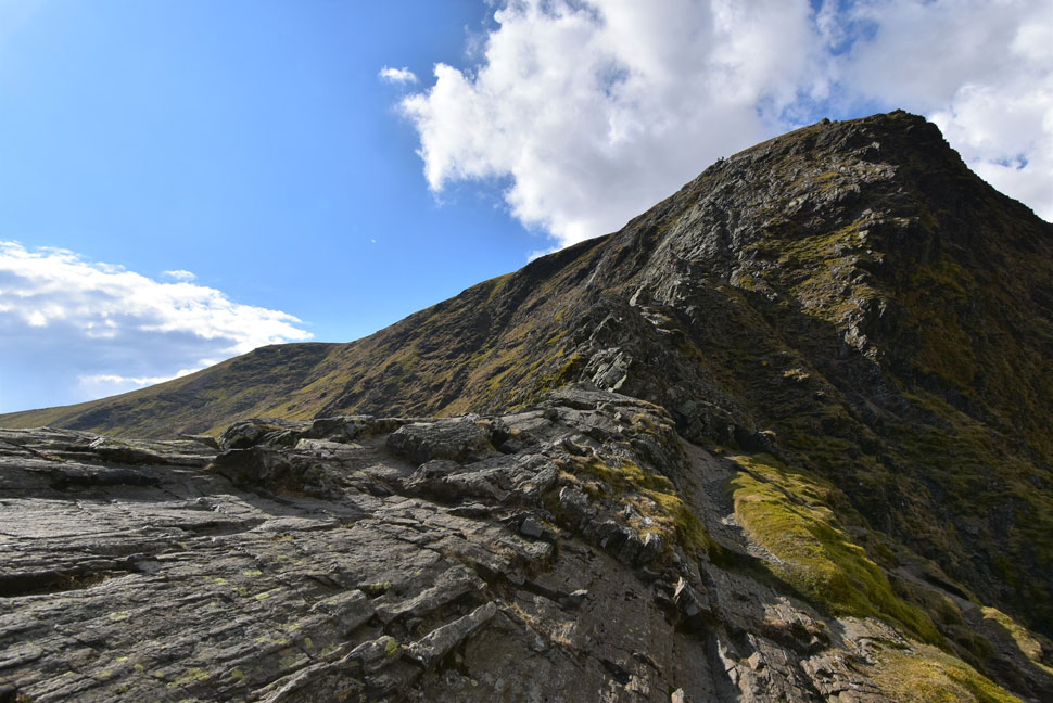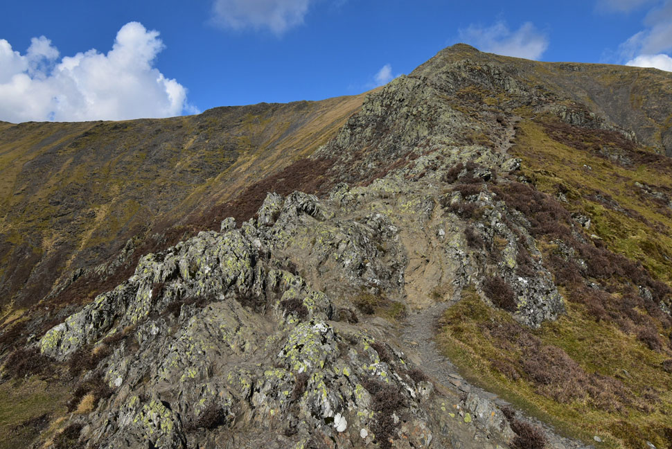 Just below the curve up ahead is where the true spine of the ridge begins. Out of shot an elderly gent climbed the entire spine from here without setting foot on the path and the reason why I know is because I could hear him huffing and puffing his way up long before I could see him, Well done that man. |