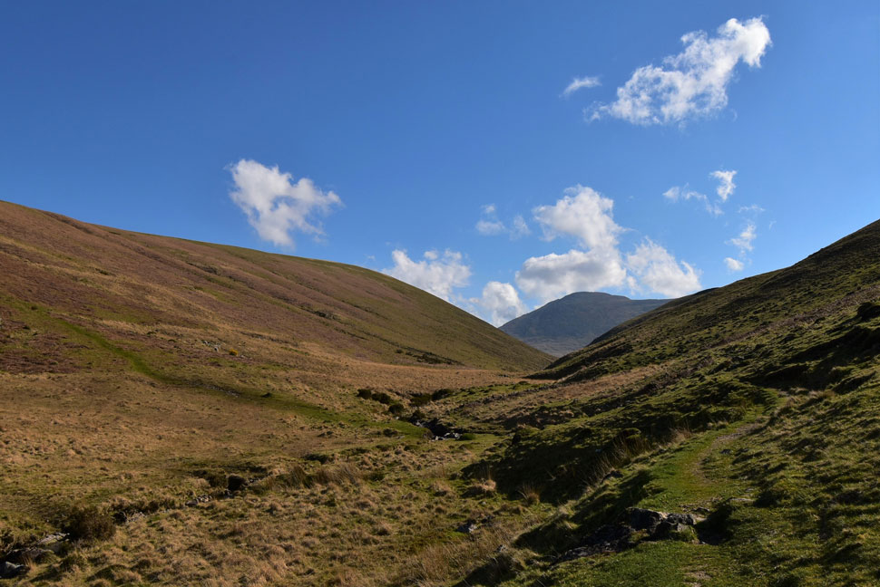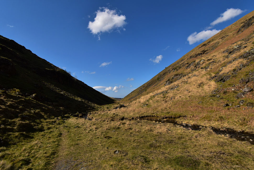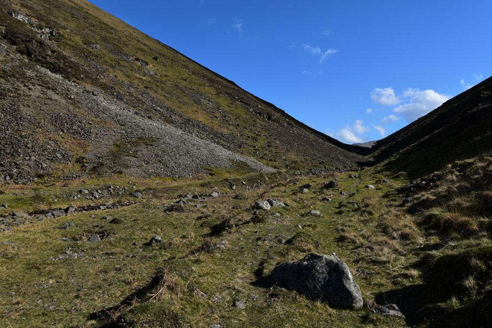 Soon the head of the valley appears where a path on the right inclines steadily from the valley. |