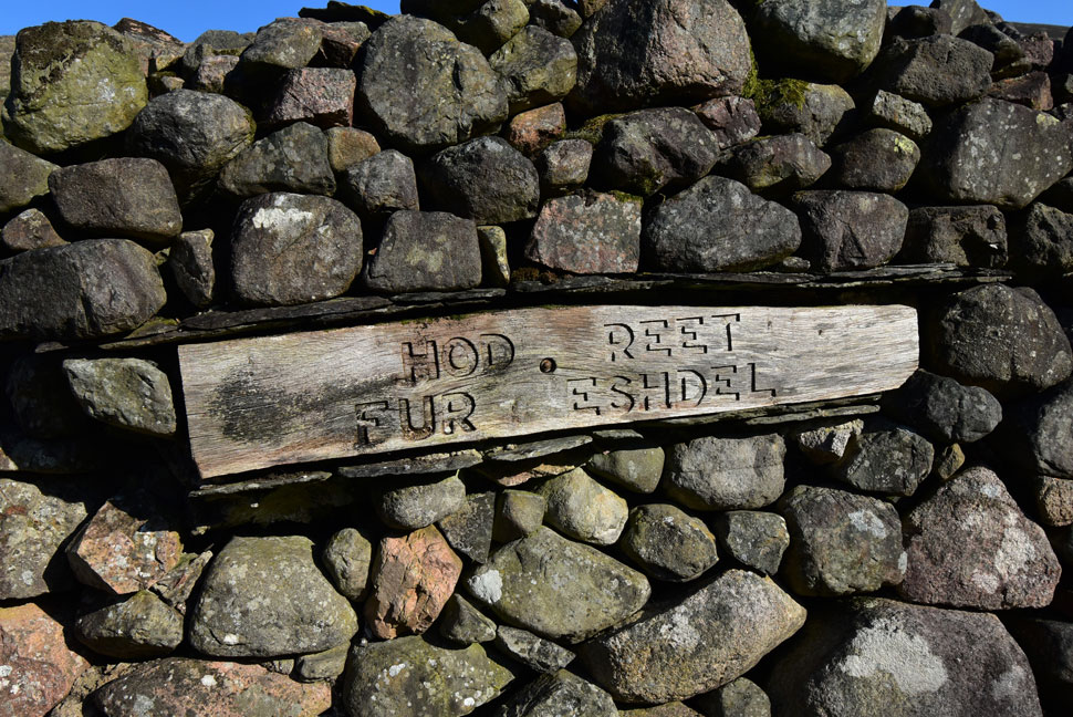 It didn't take long for the temperature to rise and sleeves were already being rolled up. We passed through Low Place Farm where we spotted half a dozen Collie pups penned up yapping away sparking Calva's ears to rise in all directions! Once through the farm yard we spotted this sign which I remembered from my first visit which reads in Cumbrian dialect 'Head right for Eskdale' |