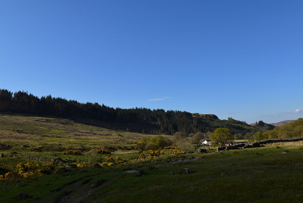 We continued with descent passing over swollen ground at times until we reached the gate in the wall which would continue our descent via Miterdale Forest seen below. |