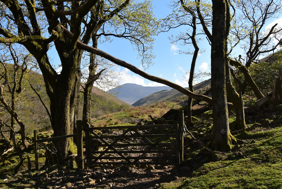 We crossed the River Mite via an old stone arched bridge then passed through a paddock before arriving at this gate with a view of Miterdale and Sca Fell ahead. |