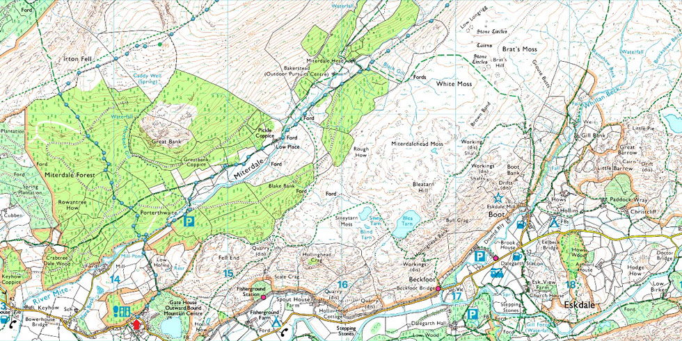 Giggle Alley - Porterthwaite - River Mite - Low Place - Miterdale - Burnmoor Lodge - Burnmoor Tarn - IIIgill Head - Whin Rigg - Irton Fell - Miterdale Forest - Porterthwaite - River Mite - Giggle Alley |