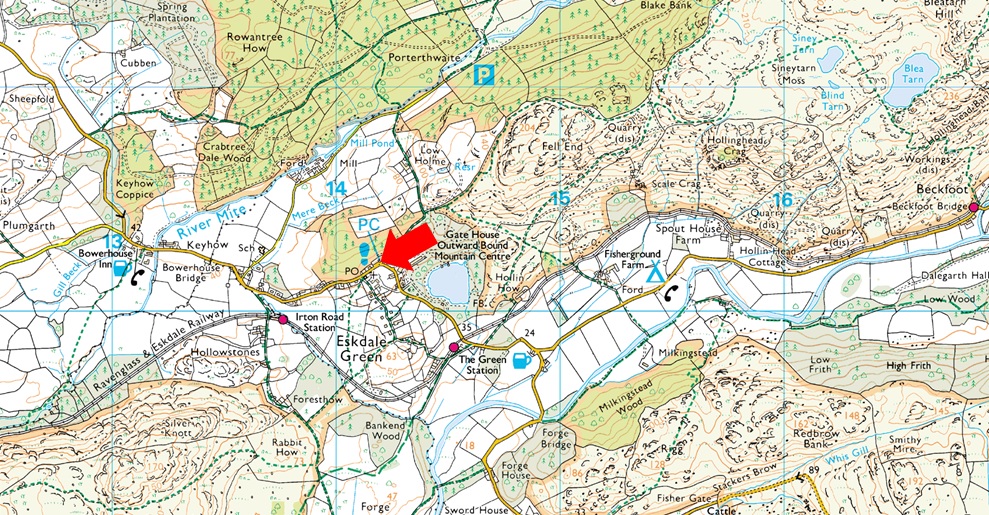 A fantastic location to leave the car for alternative routes on to the Scafells via the Mitredale Valley or simple excursions on the Ravenglass and Eskdale Railway or even a walk over Muncaster Fell. There is room for around eight cars and there is also a toilet block too with Eskdale Stores just a short stroll away. Parking is free. |