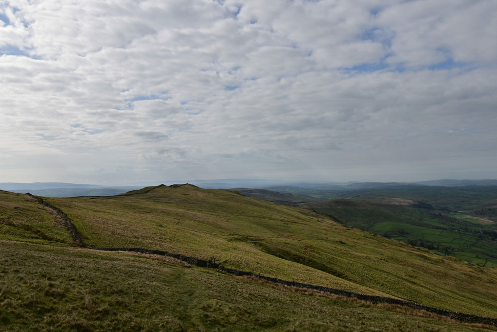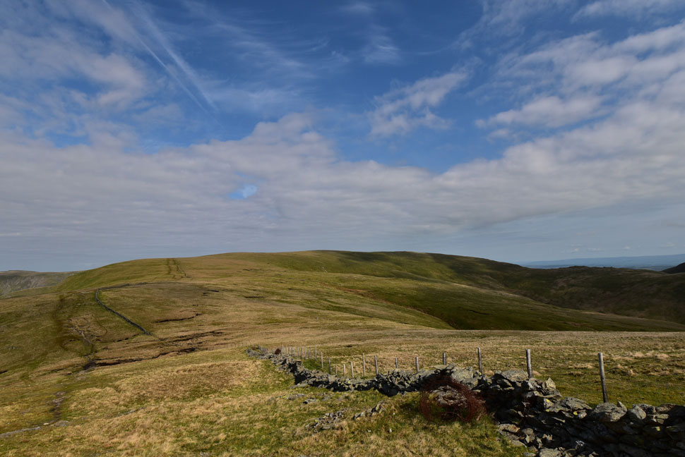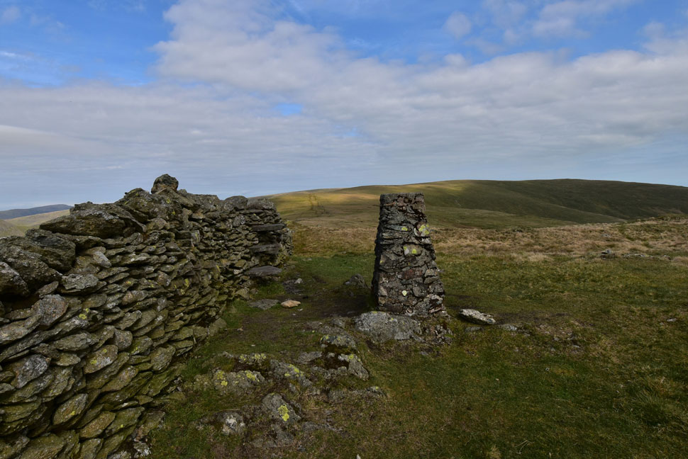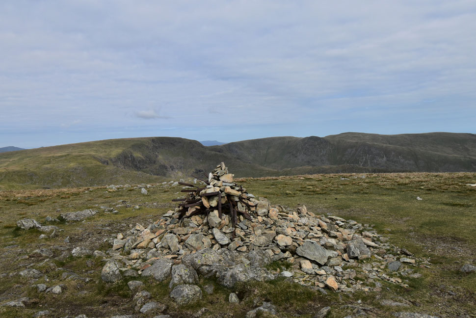 I crested the shoulder of the fell which steepened in ascent until the smooth grassy summit plateau was reached from where I tipped my walking poles horizontally and made my way towards the summit trig point. |