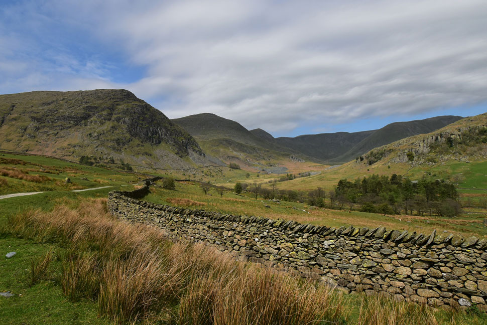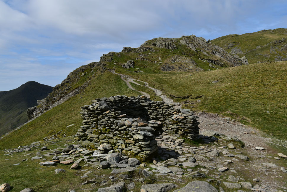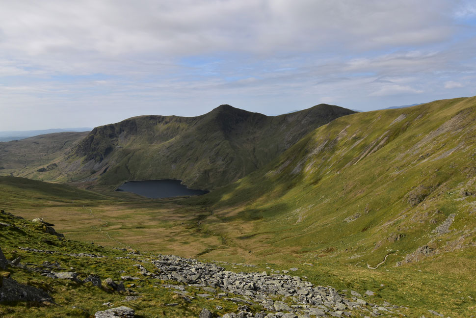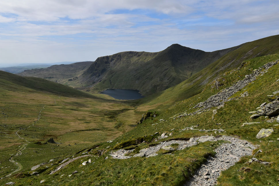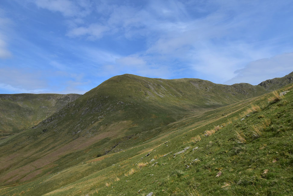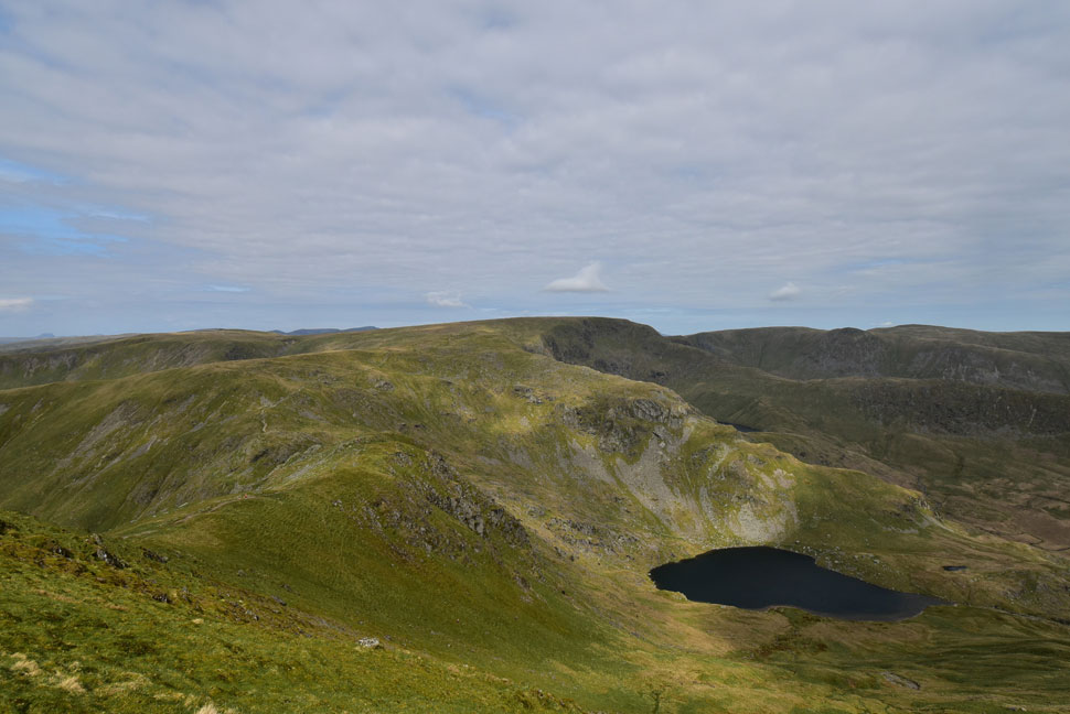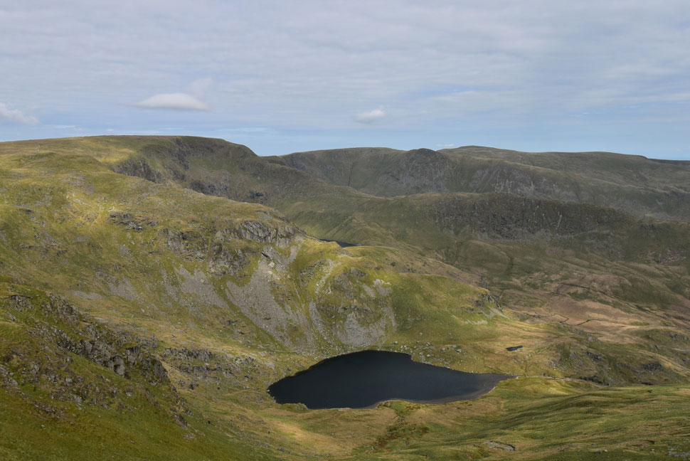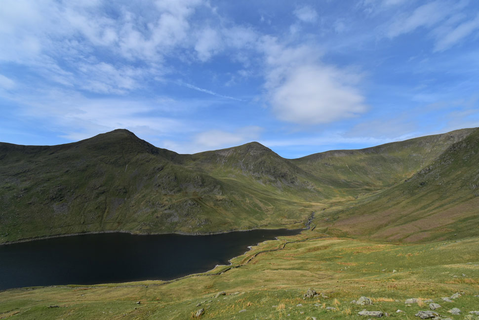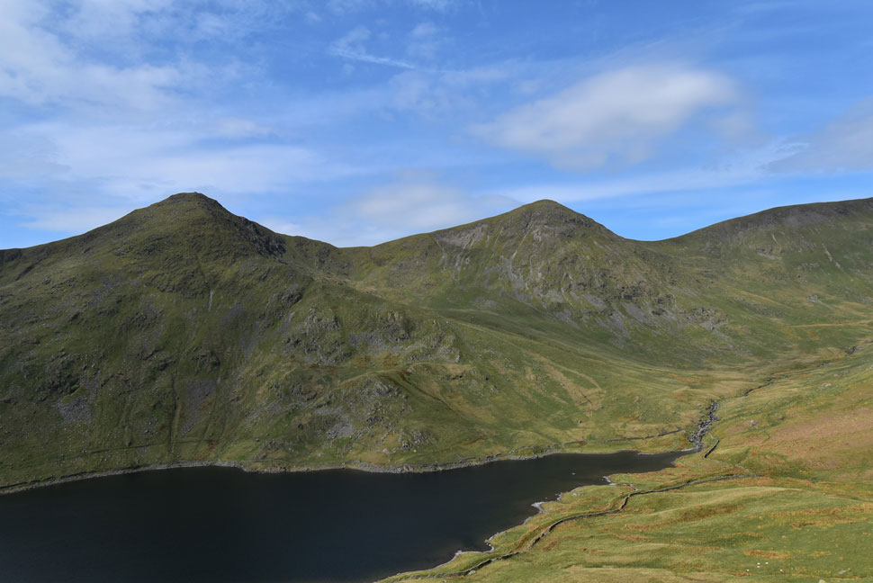 Looking back on Hall Cove (left) Lingmell End (centre) and the top of Nan Bield Pass (right) |