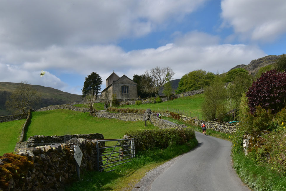 The start and end point for the fell runners was St Cuthberts Church where I pass dozens of fell runners relaxing or hydrating after a day on the hill. Up ahead the over spill car park seen on the right but I've still got a good mile to walk yet before I reach my car. |