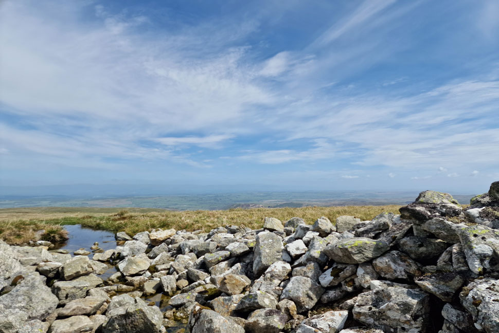 | I marched towards Low Raise knowing I could re energize and that all of the hard work was behind me. Not fifty feet from the cairn a chap and his dog appeared from nowhere and made his way towards the cairn, of all the times and places I thought. I could have kissed the chap as he strode past and disappeared as quickly as he appeared! Strange and odd but I was thankful that I now had the shelter to myself. |