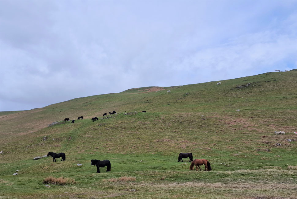 | I count 23 in all with a few out of shot. I need to be top right where the two white ponies are and to get there I double back passing the un-named Tarn and follow a path to the top of the slope from where the Low Kop ridge is gained. |