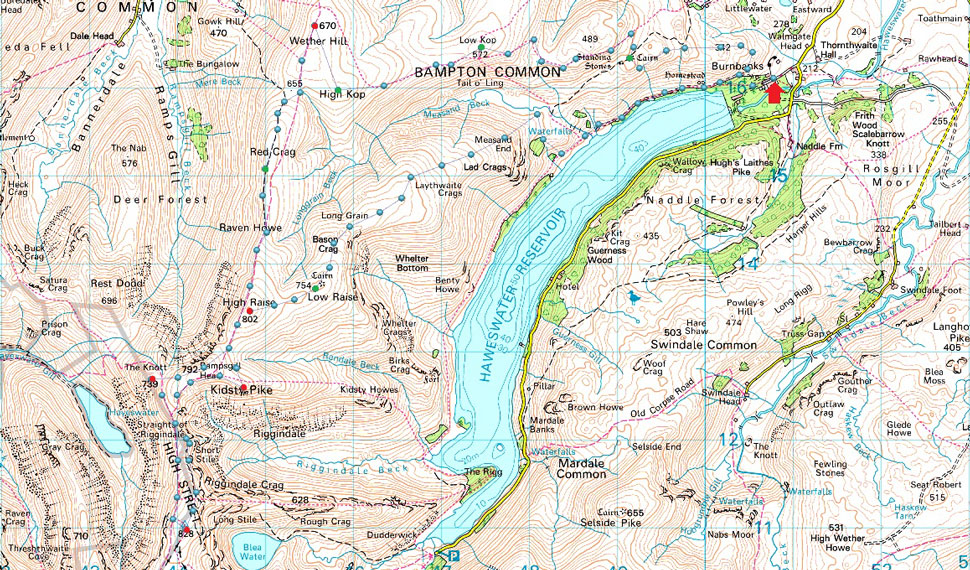 Burnbanks - Burn Banks - Four Stones Hill - Low Kop - High Kop - Wether Hill - Red Crag - Raven Howe - High Raise (no summit) - Rampsgill Head - The Knott - Straights of Riggindale - High Street - Straights of Riggindale - Kidsty Pike - High Raise - Low Raise - Long Grain - Measand End - Pultsgill Sike - Measand Beck - Haweswater Shore Path - Burnbanks |