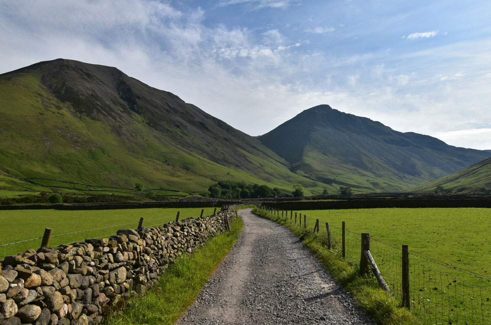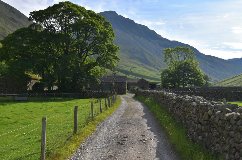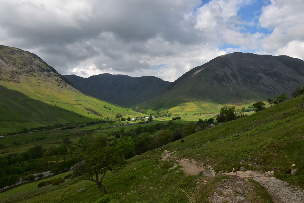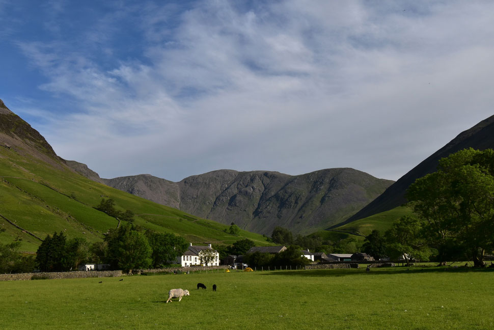 The best of the sunshine had been confined to the morning and although the sun still broke through more cloud was now filling the gaps. As I descended into valley level the temperature rose at which point I'd have done anything for a cool summit breeze. The couple from Barrow crossed Lingmell Beck and disappeared under a canopy of trees as they made their way through the pasture behind what was Wasdale School. It was my turn to cross Lingmell Beck via the footbridge before dropping onto closely clipped grass where I stopped to kick the heels into the backs of my boots, the shift felt heavenly and I thanked nearby sheep for keeping the grass so short.