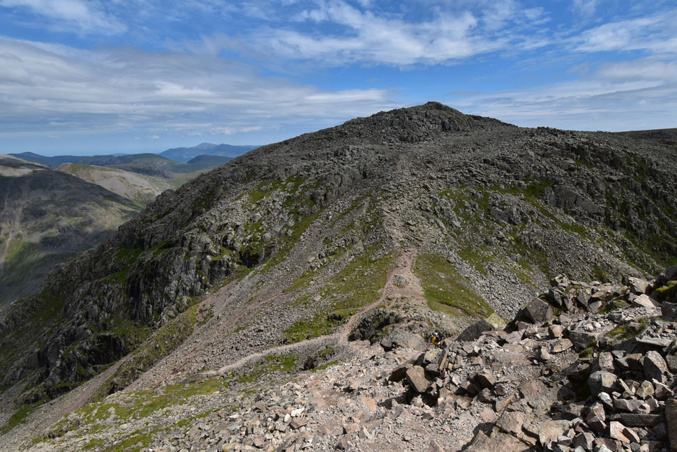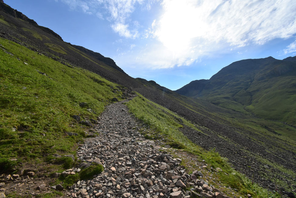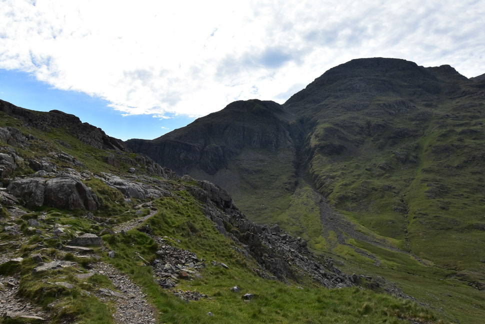 Ascending towards Sty Head with The Band, Great End and Long Pike on Great End seen right. |