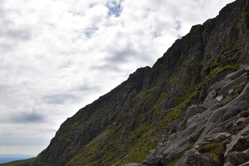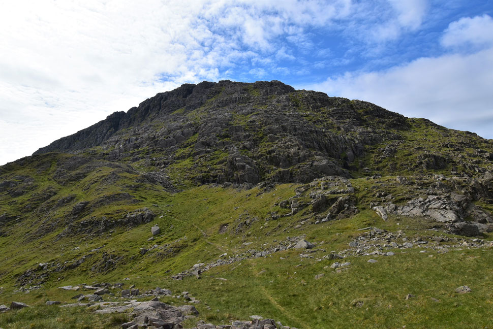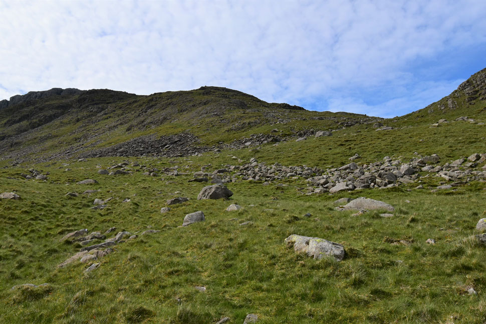 Todays route of ascent is to follow the footpath seen foreground which directs towards the left before diverting right via easy scramble before ascending a steep grass rake. |