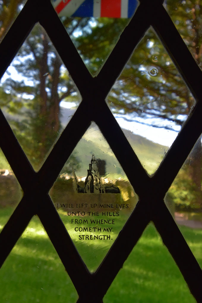 A dedication to the Fell and Rock Climbing Club (FRCC) etched into the window of St Olaf's. |