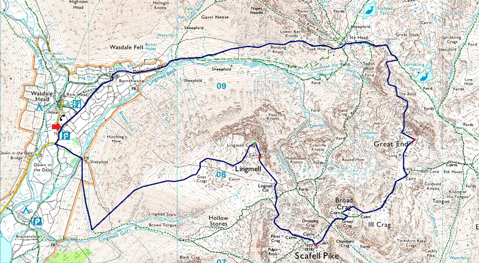 Wasdale Head - Burnthwaite - Moses Trod - Sty Head - The Band - Great End - Broad Crag - Broad Crag Col - Scafell Pike - Lingmell Col - Lingmell - Goat Crags - Down-in-the-Dale - Wasdale Head |