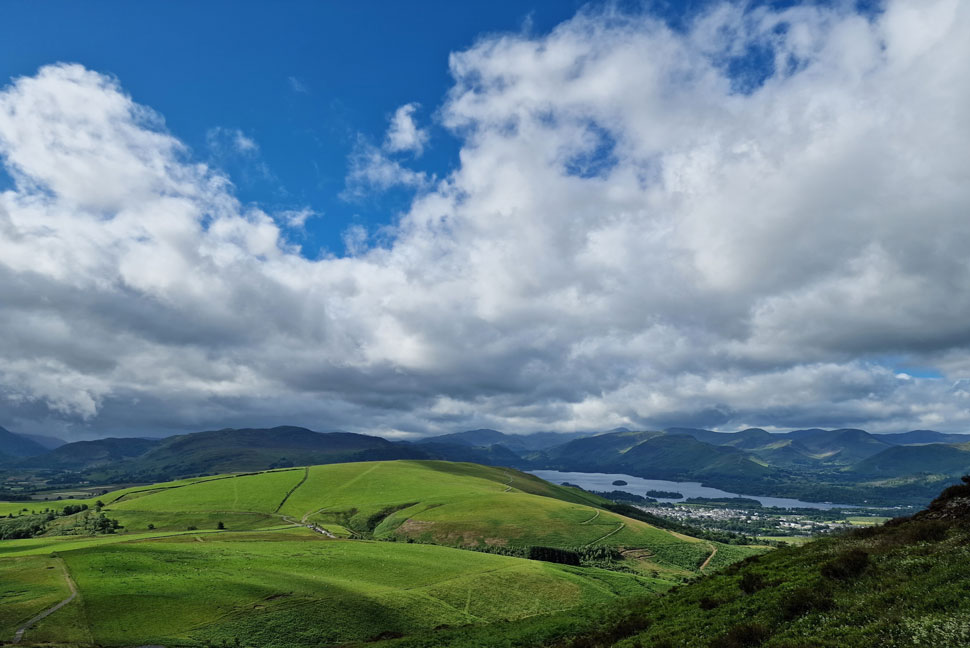 The view towards Low Rigg, High Rigg, Walla Crag and Bleaberry Fell. |