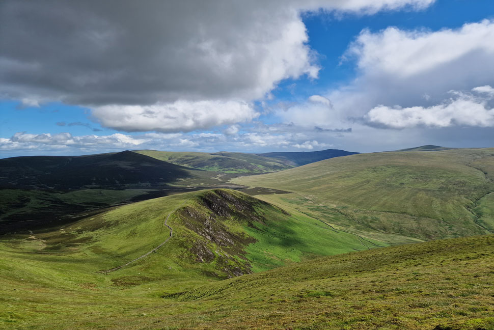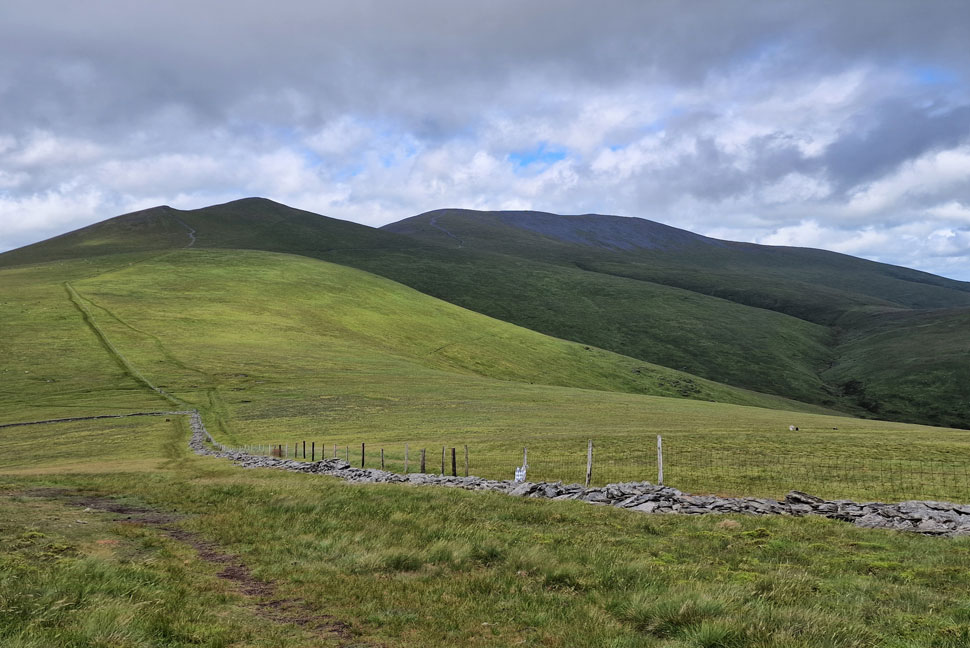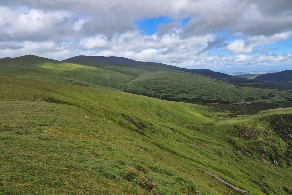We descended the full length of Burnt Horse north ridge taking us to within spitting distance of Skiddaw House as our view was filled with Little Calva (left) and Great Calva (right) and the summit of Knott beyond. |