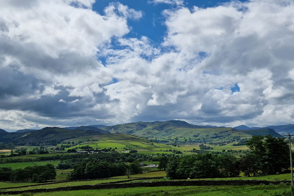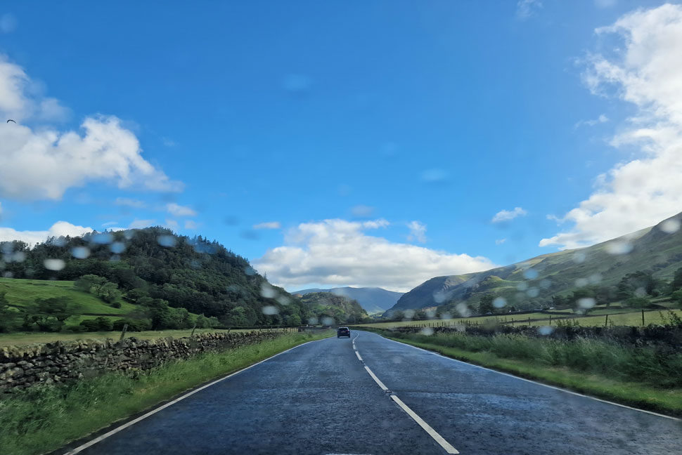 Blue skies and sunshine as we drove towards Keswick. |