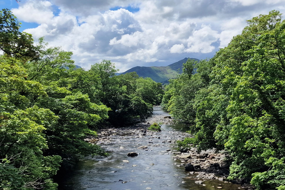 Causey Pike and Rowling End from the River Greta. |
