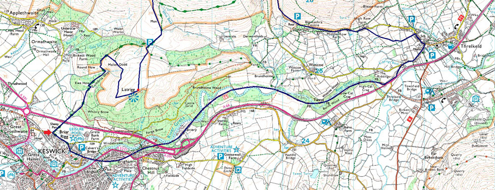 Brundholme Road - Spooney Green Lane - Cumbrian Way - Mallen Dodd - Latrigg - Hawell Monument - Skiddaw Tourist Path - Lonscale Fell - Lonscale Pike - Burnt Horse - Cumbrian Way - Blencathra Centre - Threlkeld - A66 - Keswick Railway Path - Brundholme Road |