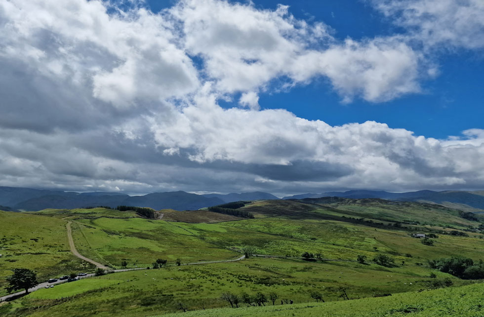 Despite the wind the warm sunshine and the steep ascent was already making us regret adding the soft-shells. The area of trees in the centre is Great Meldrum which will be gained from the far right of the trees with Little Meldrum seen as the bump over to the left. |