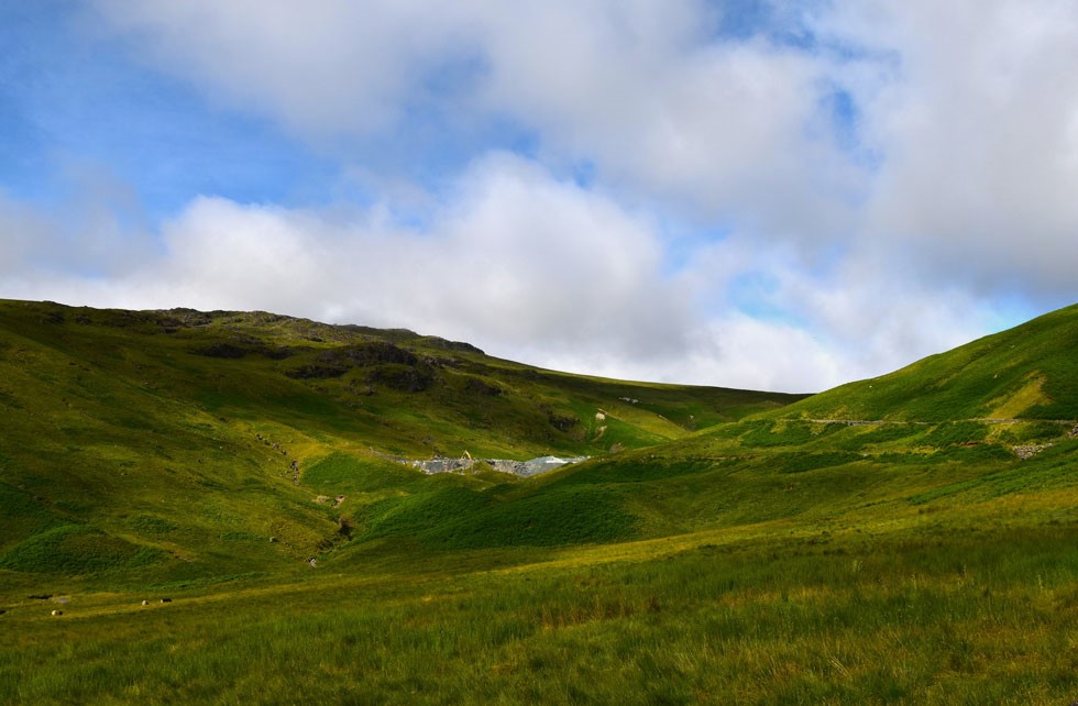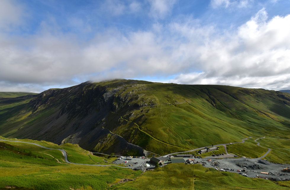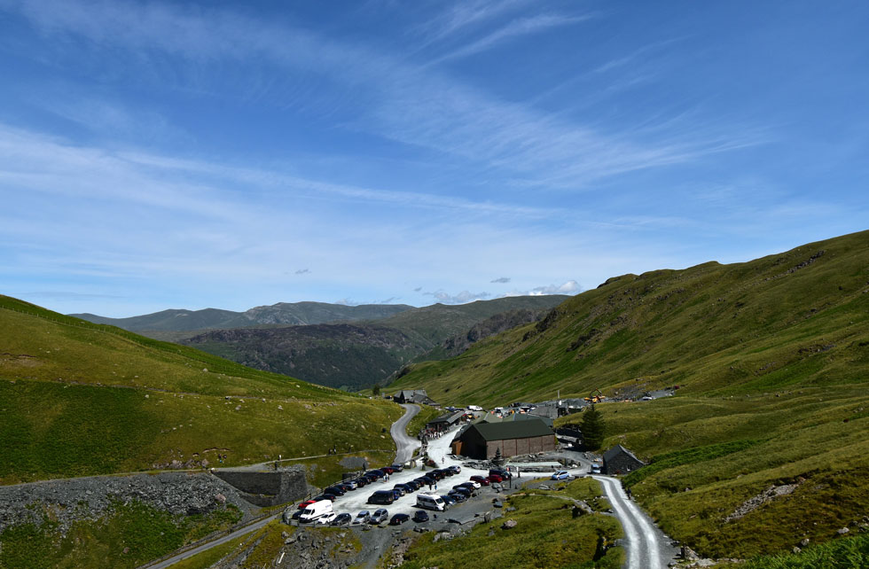 Somehow we had to tear ourselves away from the views as the heat from the afternoon sun scorched exposed skin. With the flank of Grey Knotts to our immediate right we continued towards Drum House where folk rested in the sunshine before joining Lakelands straightest half mile back to Honister. Feet were beginning to ache and I longed to kick them into the backs of my boots but not until the mine was reached. Rod traced left and passed through the car park while I passed the large shed and peered in through the dust and blackness, a pair of eyes stared back and continued with his work. Rod and I linked up again as we passed a large group gearing up wearing helmets and harnesses no doubt waiting for the Via Ferrata.