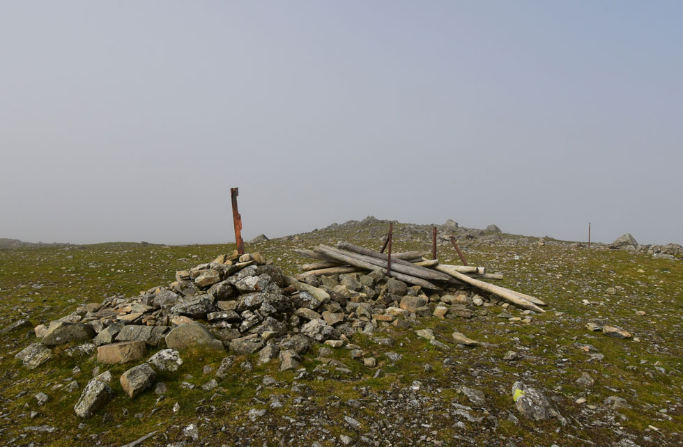 Instead of descending to Windy Gap Rod suggested that we should wait to see if the cloud would lift so we hunkered down in the summit shelter and waited to see what happened. The cloud did break only for it to roll back in again so after a good ten minute we left the shelter and began our descent towards Windy Gap. |