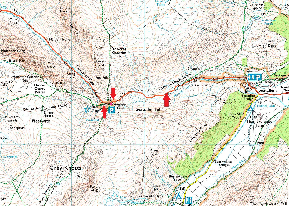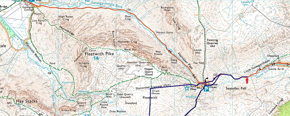 With the cars locked we set off towards the top of Honister Pass only being passed by the odd car or two. We soon arrived at the junction where a gravel road leads onto the mine overspill car park. It's from the other side of the car park does the steep ascent on Grey Knotts begin. |