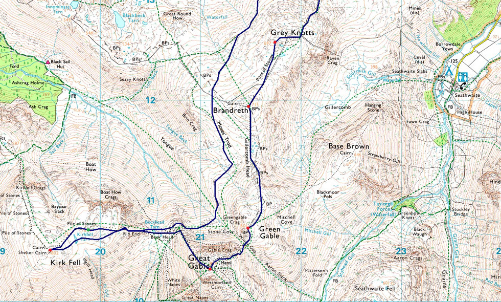 Honister - Grey Knotts - Brandreth - Gillercomb Head - Green Gable - Windy Gap - Great Gable - Beck Head - Rib End - Kirk Fell North Top - Kirk Fell - Rib End - Beck Head - Stone Cove - Moses Trod - Drum House - Honister |