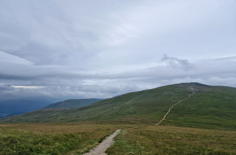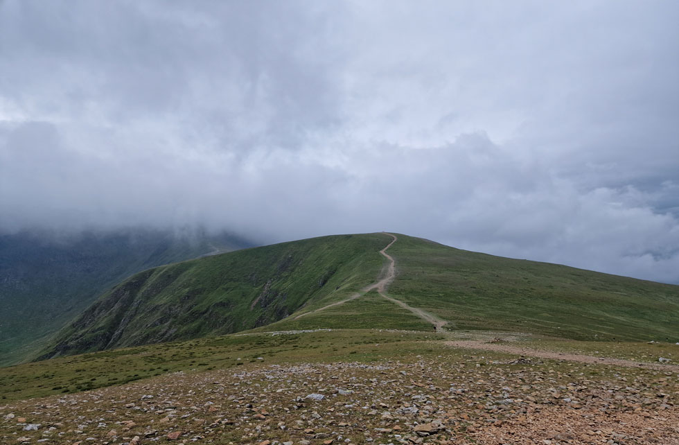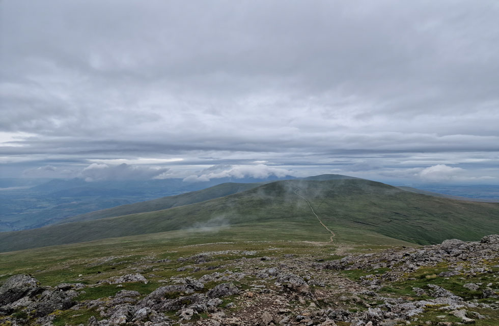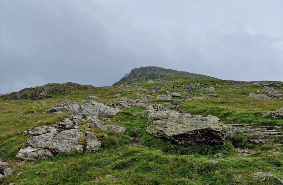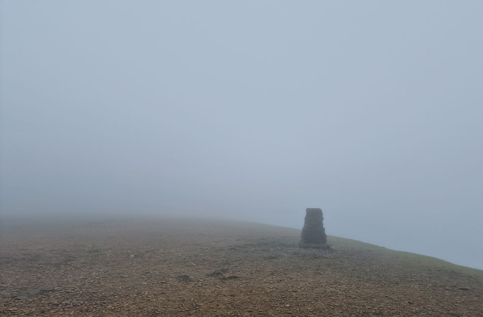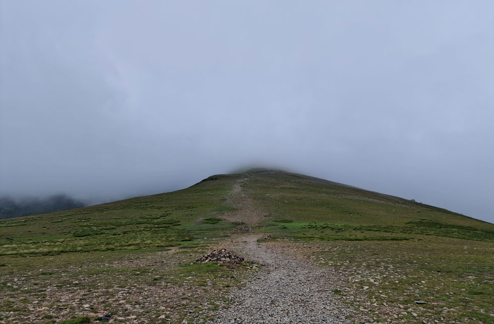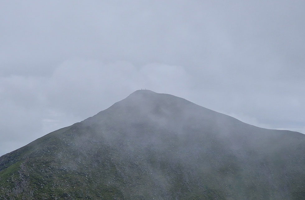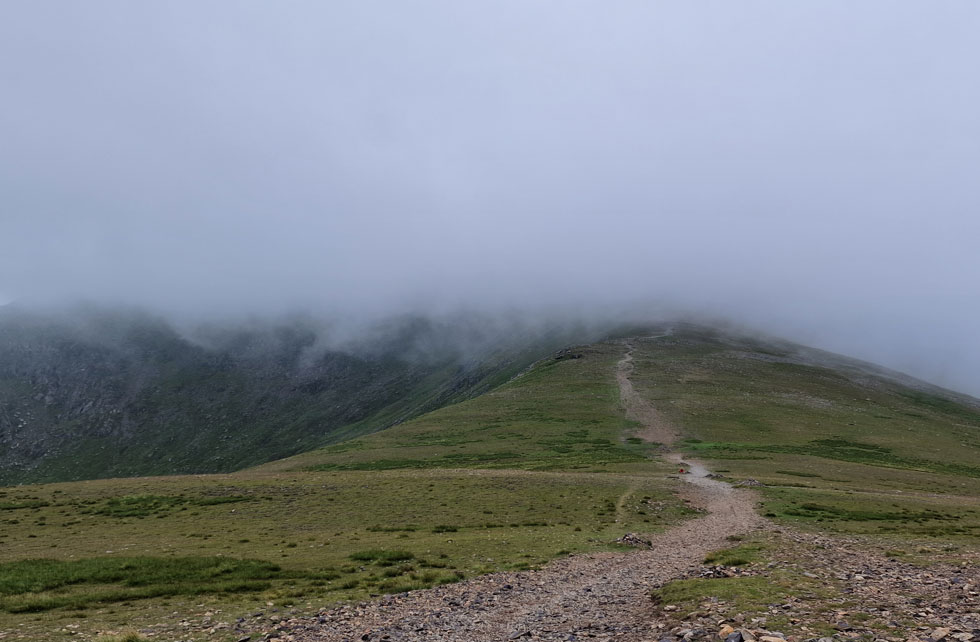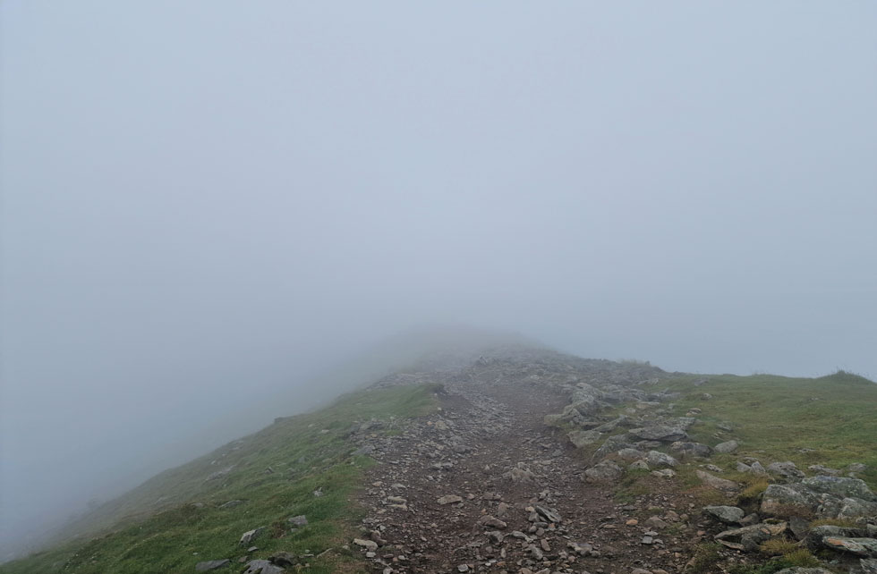 By now we were just below the cloud line but I also noticed that the cloud had started to gather below us too and with it, came an increase in wind. We continued to climb no more than a half a dozen steps by which time we could feel rain in the air - no sooner had we felt it we were in it. Within the same pack of walkers all downed packs more or less at the same time to add waterproof jackets, this was no passing shower it was here for good. One chap at the front of the pack added his waterproof jacket then must have thought 'sod this' and began his descent smiling as he passed us. The chap was obviously a novice but I admired his decision. He was a solo walker caught in a pack of fellow solo walkers who could have guided him to the summit but it wasn't to be, I quite liked that.