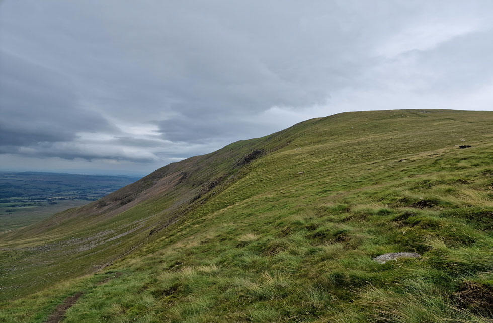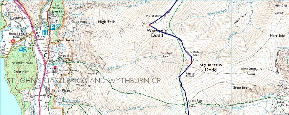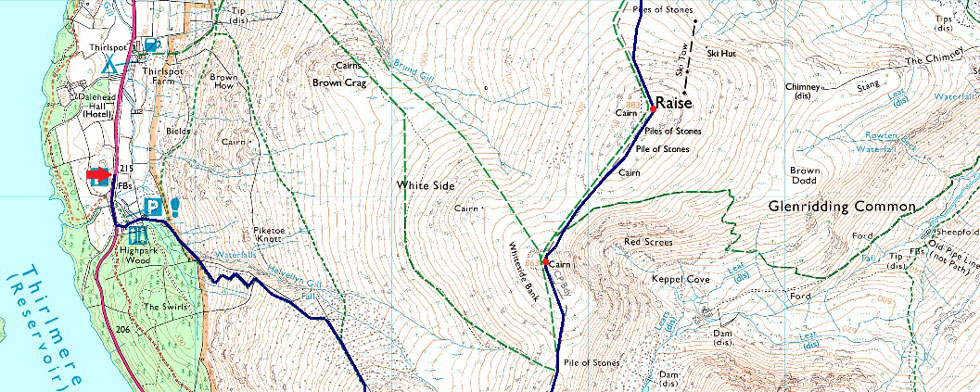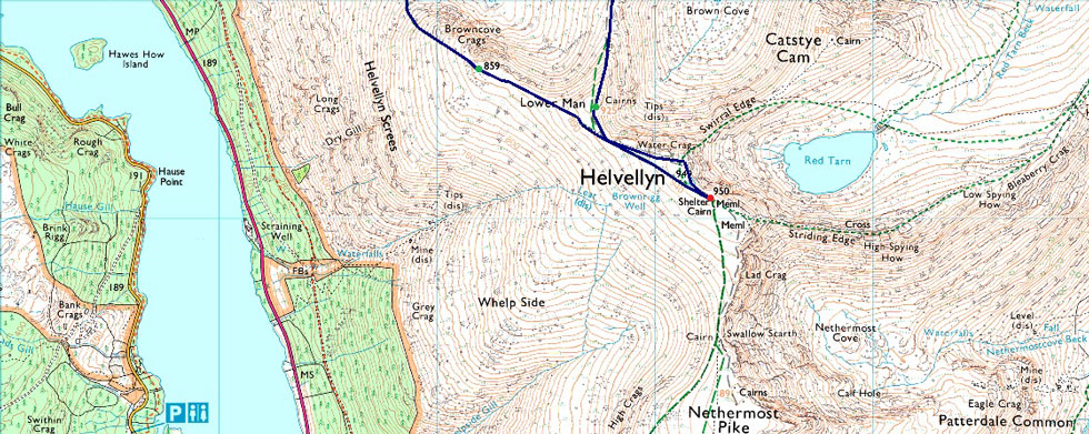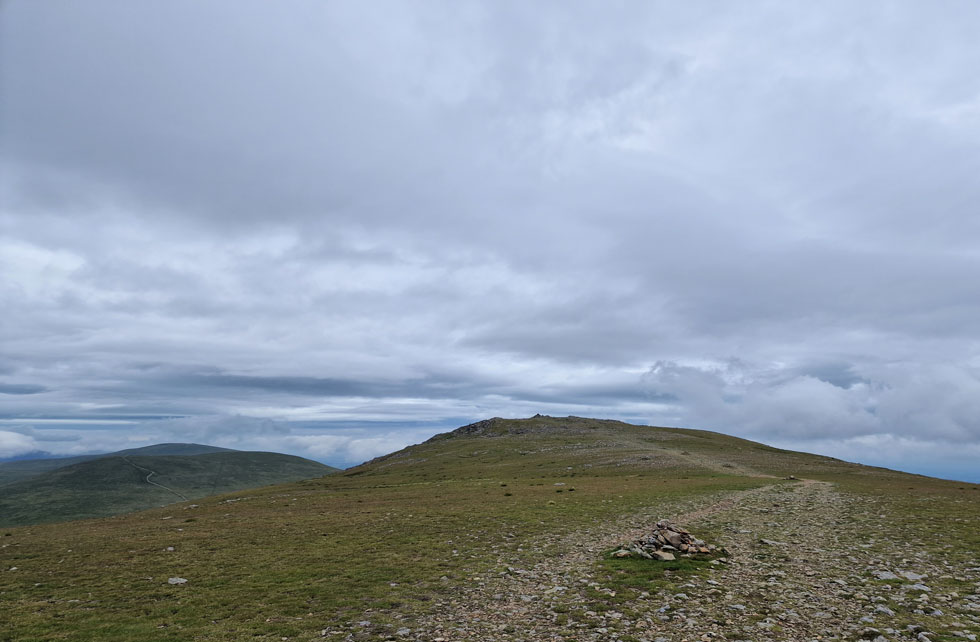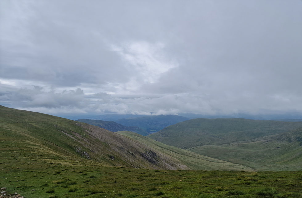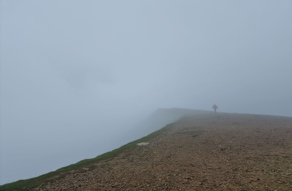 Rod and I broke away from the pack and shouldered Browncove Crags with only the solo walker wearing the red jacket ahead who seemed to discover his second wind, he was flying. By the time we reached Browncove Crags summit we had entered the cloud layer and the wind increased further. As always when here I peered down into the climbers gully but saw nothing but a few feet of rocks then an abyss of murk, Rod advised to be careful at the same time I started to back away. By now red jacket guy had disappeared into the cloud and the rest of the pack was still a good fifty yards behind us. We had the final push on Helvellyn to ourselves. |