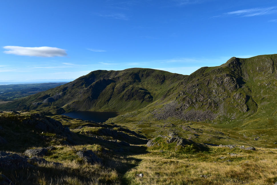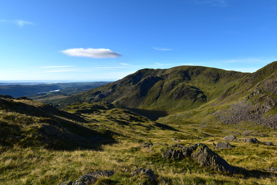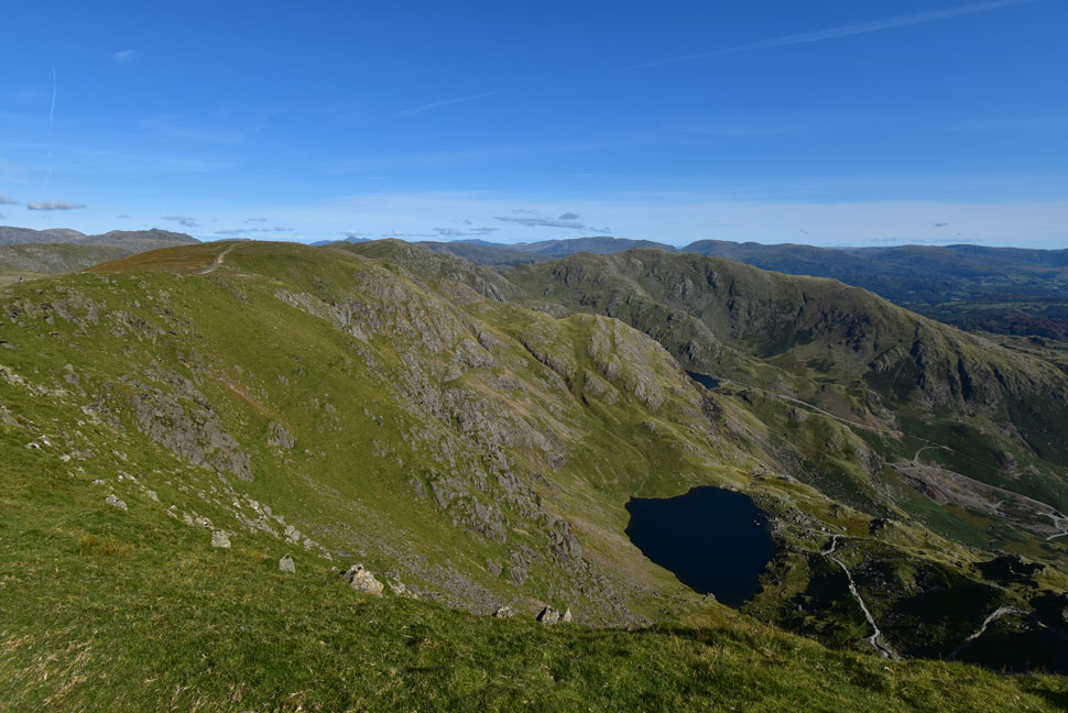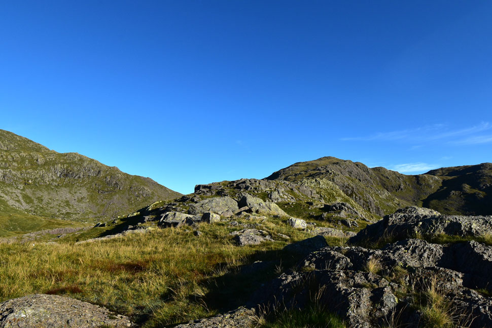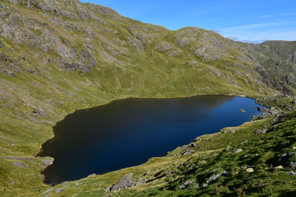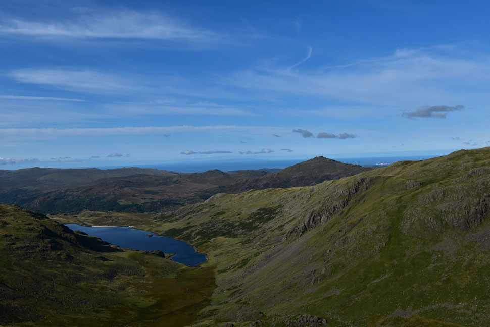 From Levers Hawse I take in the view towards Seathwaite Tarn, Harter Fell (Eskdale) and Green Crag. |