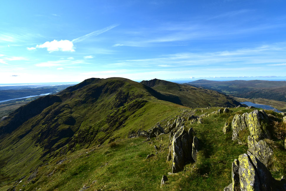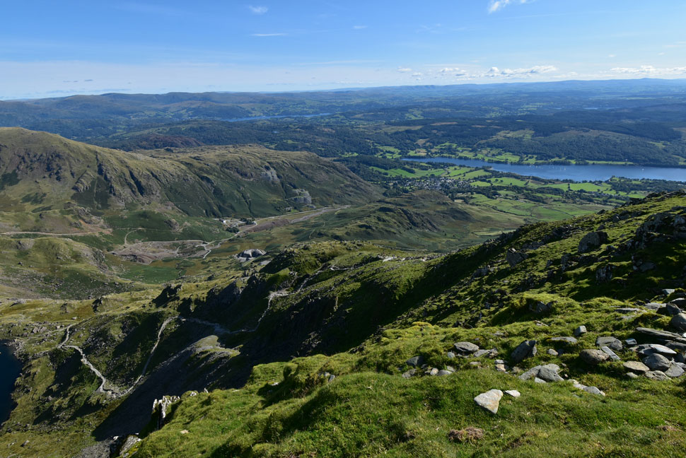 Coniston Old Man, Levers Water, Brim Fell and Great How Crags from Black Sails summit. |