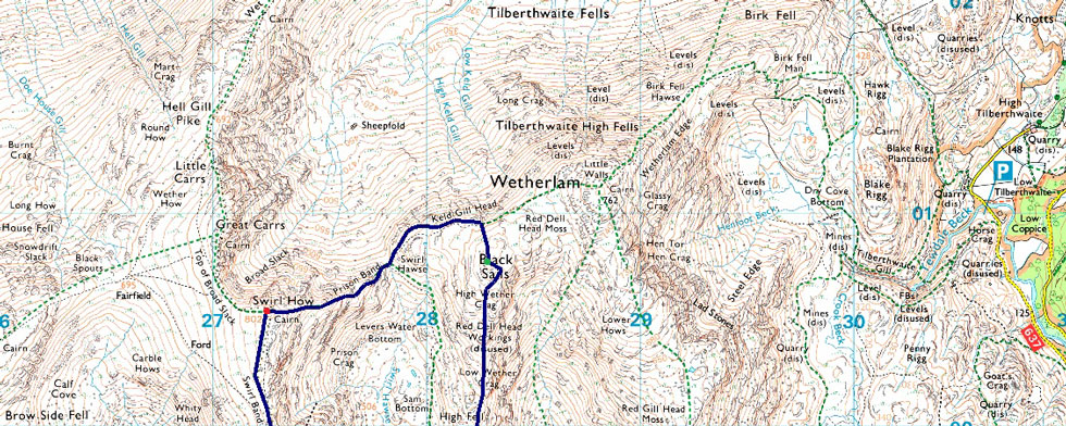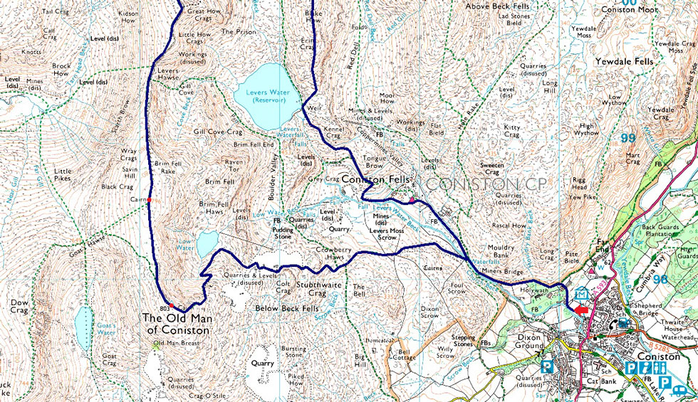 Church Beck - Miners Bridge - Coppermines - Levers Water - Black Sails - Swirl Hawse - Prison Band - Swirl How - Swirl Band - Great How Crags - Levers Hawse - Brim Fell - Coniston Old Man - Coppermines - Miners Bridge - Church Beck |