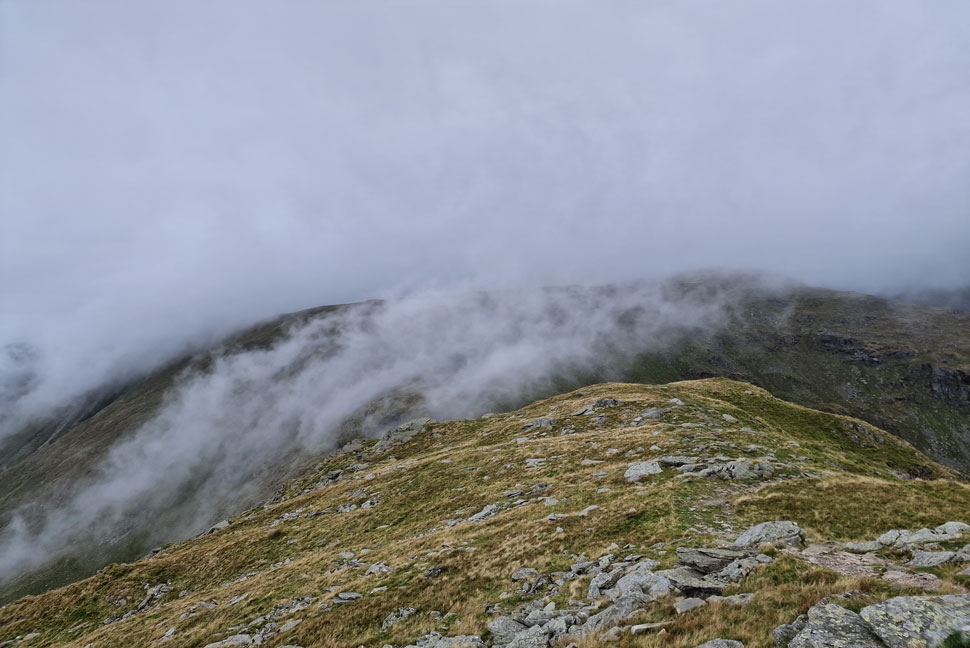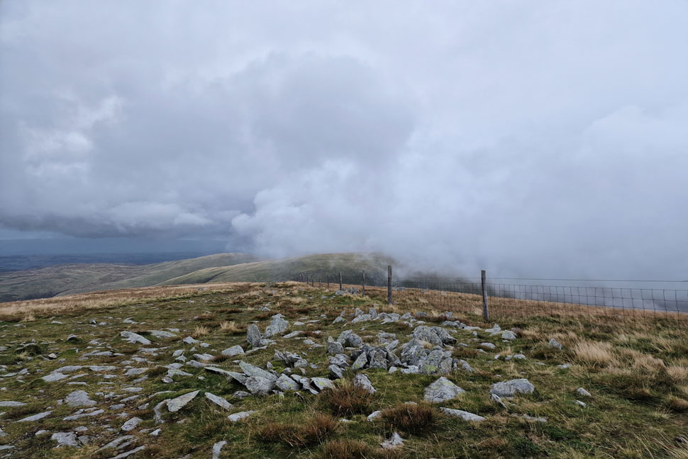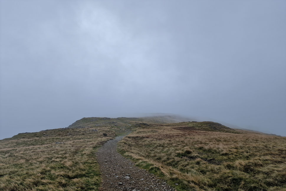 I left the summit of High Street and followed the stone wall for a short while before parting left for the singular grassy track where visibility was cut to just 10 yards in places. After joining the stone path the cloud would part then close in again. I reached the summit in eerily silence even the wind seemed to have dropped. It's been some months since I last walked in cloud and it's easy to forget the silence it brings.