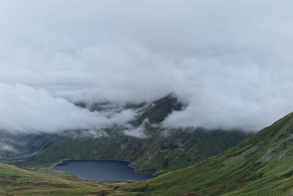 As I approached the top of Nan Bield the wind strengthened and carried the cloud over the ridge sometimes obscuring Harter Fell and others leaving it completely clear. Boy have I missed scenes like this. |