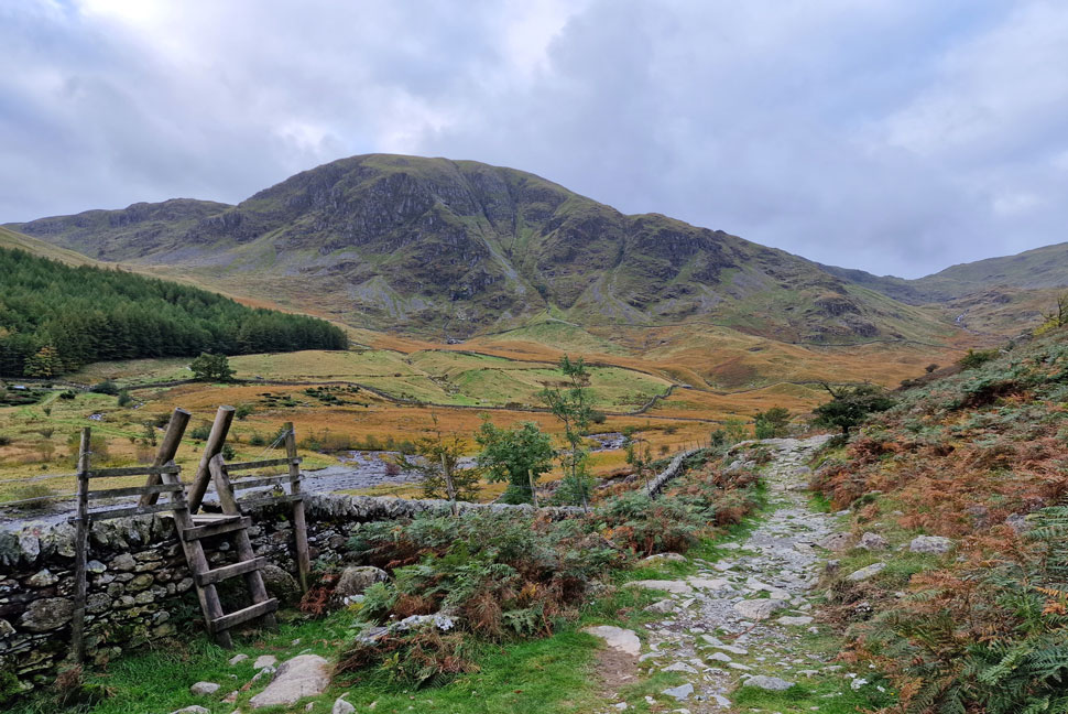 As with most lakeland passes the ground underfoot was rough which didn't seem to hold me back as I took in the twist and turns before the pass begins to level. Peering up to Harter Fell gully I was drawn back to a conversation I had with the late Ron Black who asked me "had I ever attempted to climb it" "are you trying to kill me" I joked back. The car park was much busier now but there was still places to park as I pass through the Deer gate around the same time a lady with a Cocker Spaniel arrived from Haweswater permissive footpath "what a perfect day for walking" she cheerily smiled. I agreed while hooking my jacket into a waiting coat hanger.