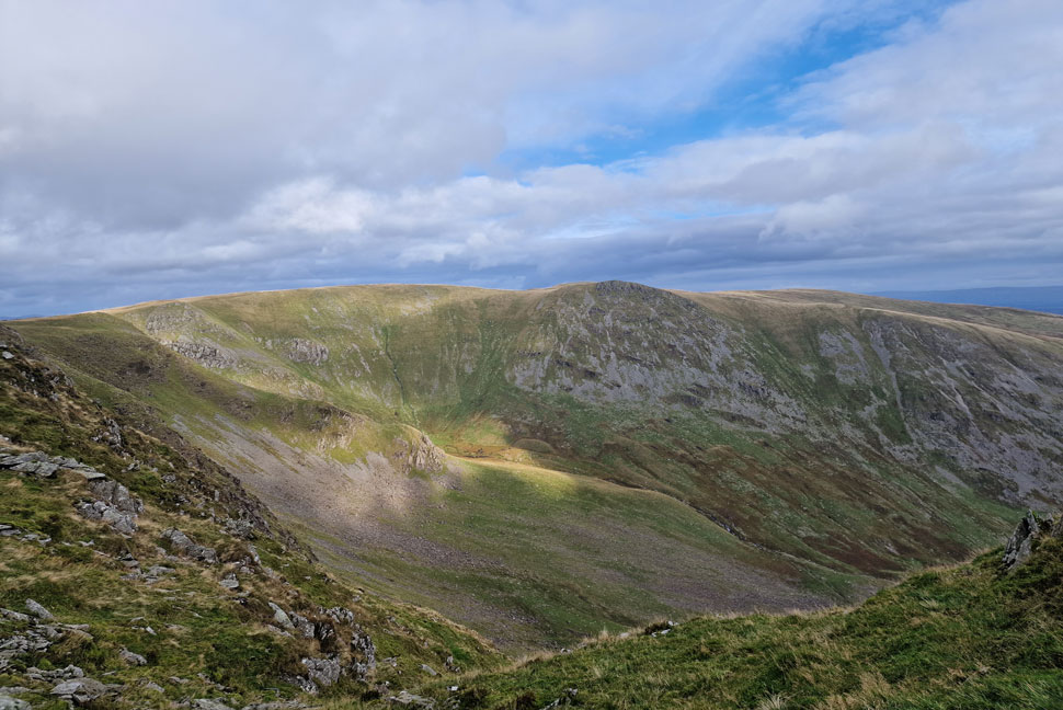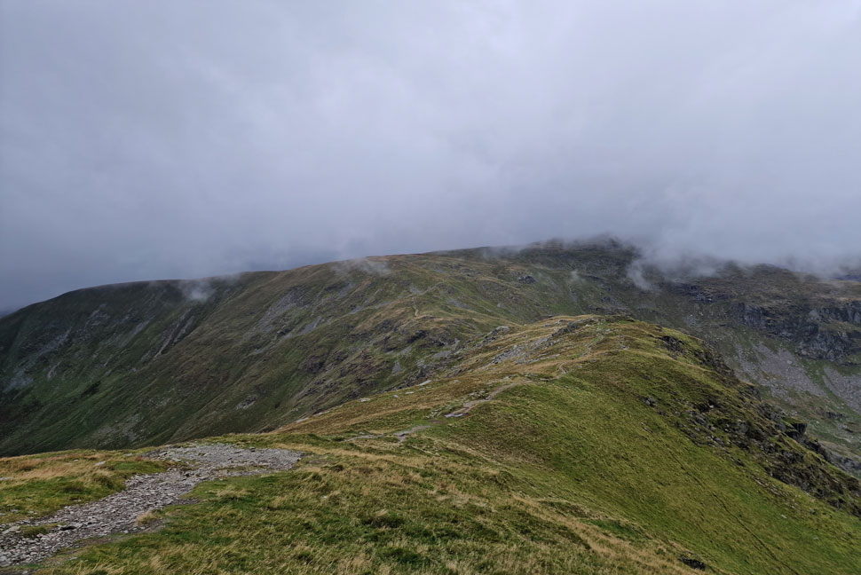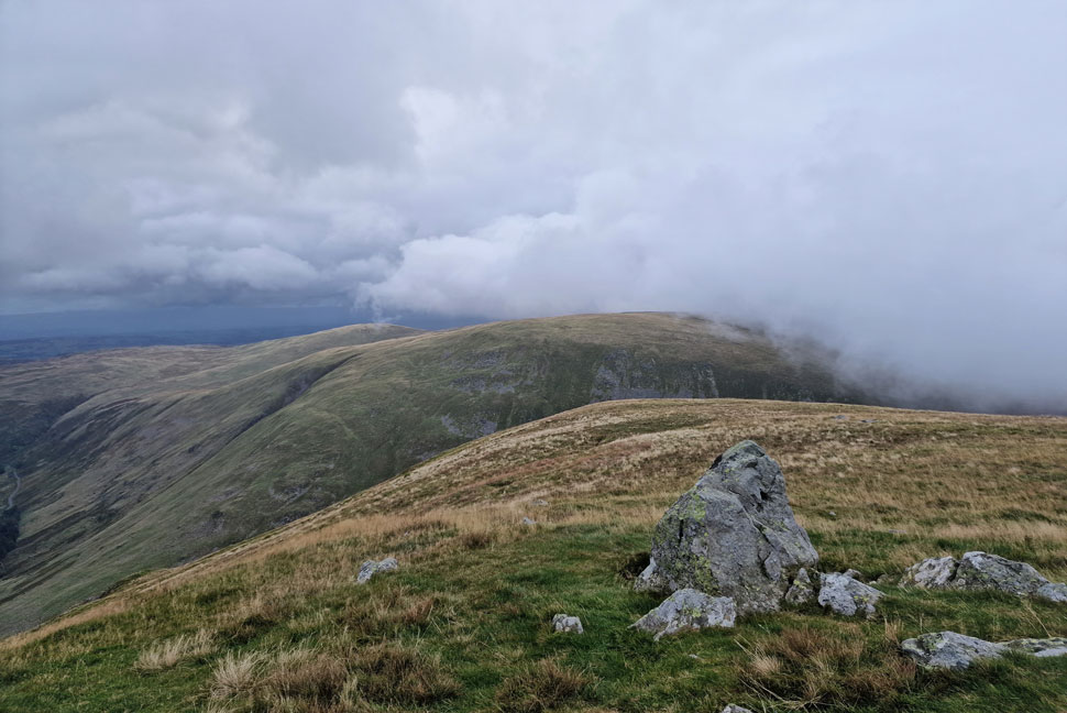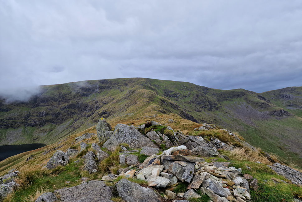 The view back along the ridge towards Lingmell End (left) and Mardale III Bell, below cloud (right) |