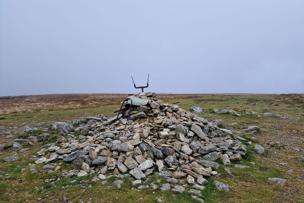 Rain was still in the air as I crested the summit and walked the short distance towards the summit cairn where more twisted old iron fencing seems to have been added. With limited views I left the summit and walked towards the third carin on the east side of the summit. |