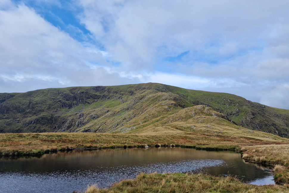 With Rough Crag behind me I detoured left and joined a single track towards Caspel Gate Tarn where I was blessed by a very momentary hint of blue sky and sunshine. |