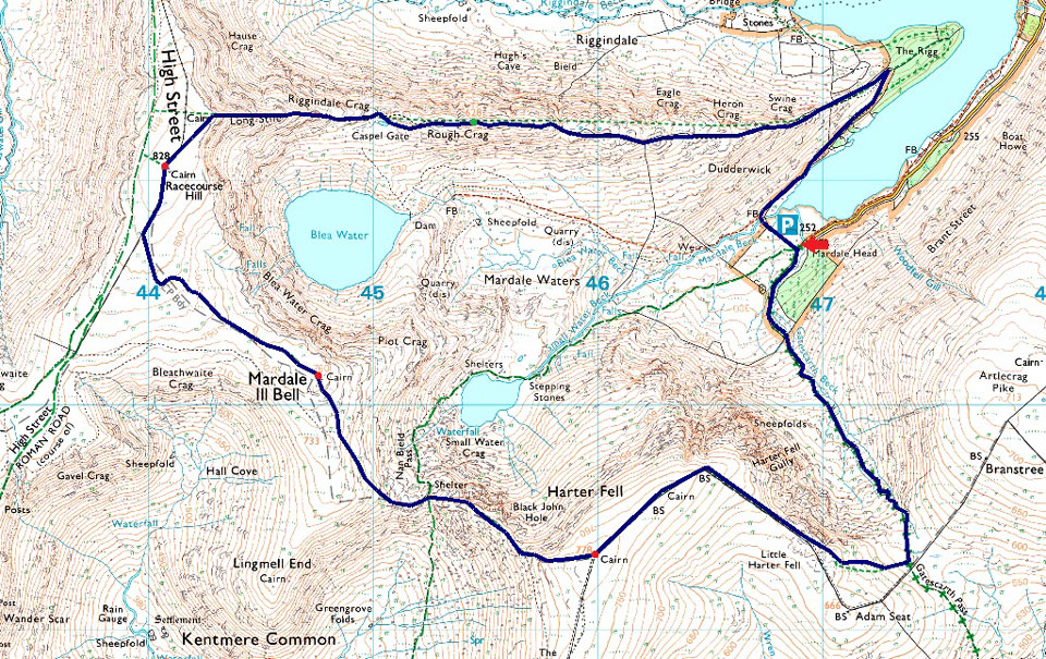 Mardale Head - The Rigg - Rough Crag - Caspel Gate - Long Stile - High Street - Mardale III Bell - Top of Nan Bield Pass - Harter Fell (Mardale) - Little Harter Fell - Top of Gatescarth Pass - Mardale Head |