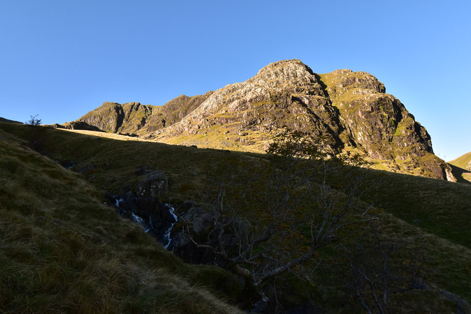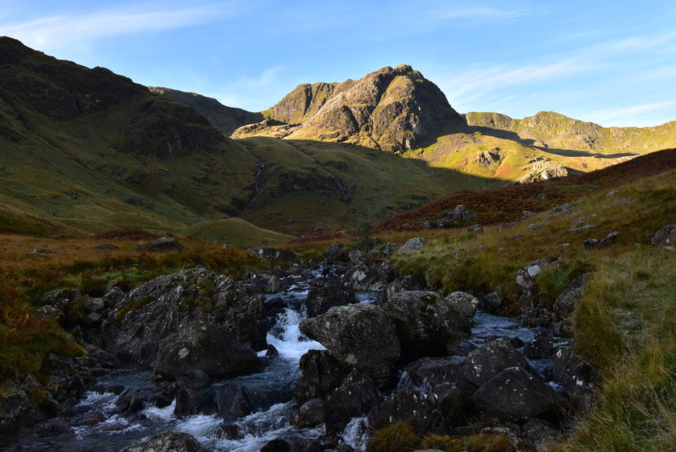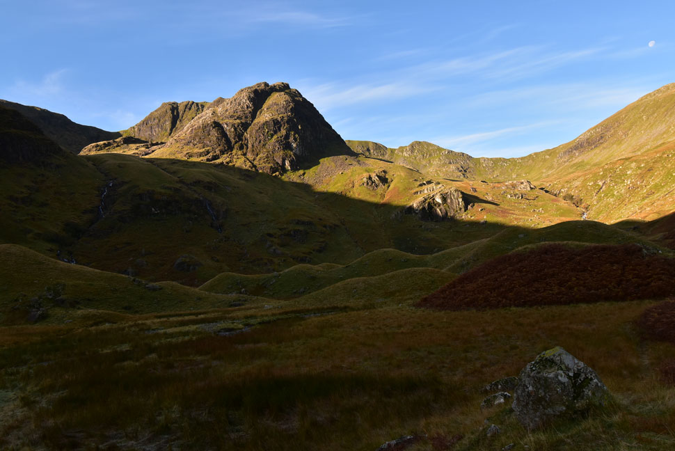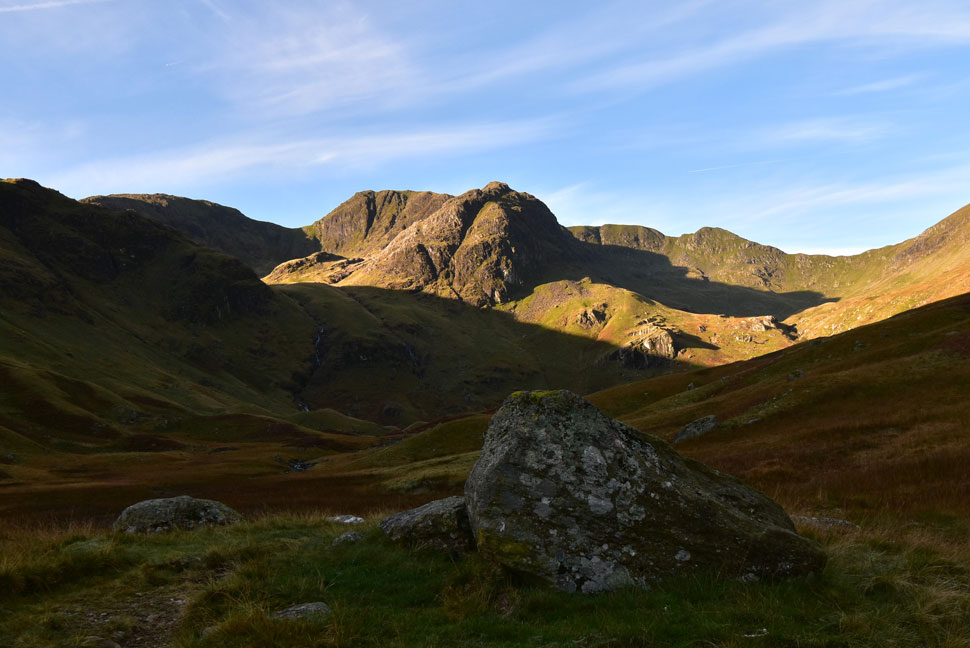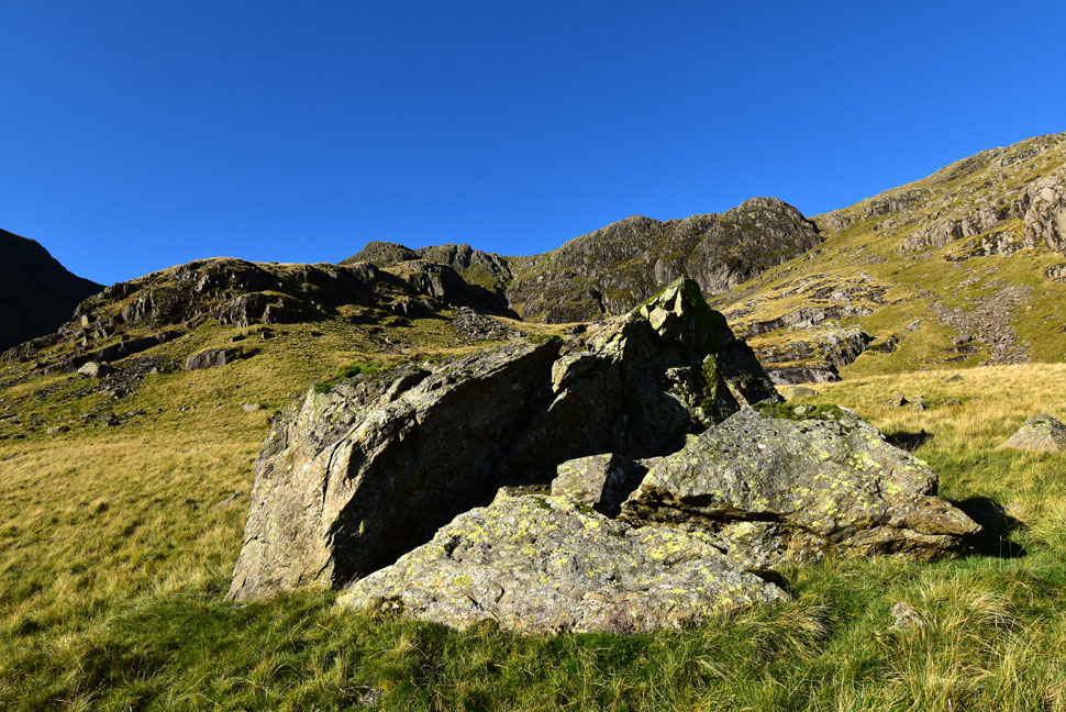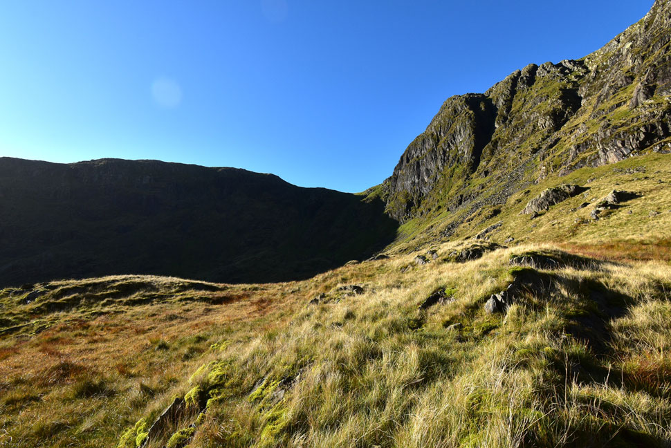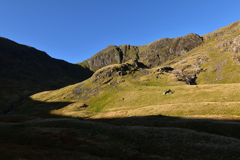 Hart Crag (left) and Scrubby Crag (right) dominate Link Cove and even though I was still getting my breath back I was starting to plot my route of ascent. Once into the sunlight I head towards the large boulder seen foreground, then ascend towards the right of the scree continuing on to the base of Scrubby Crag from where I'll pick up what appears to be a grass terrace before ascending right towards the grass gully seen far right.