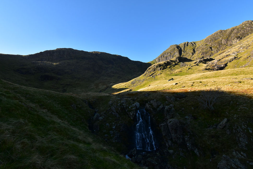 That's Link Cove over on the left which I will ascend via the far left falls. If ascending Greenhow End via the grass rakes ascent would be via the falls over on the right. Both ascents to gain the Link Cove are extremely steep. |