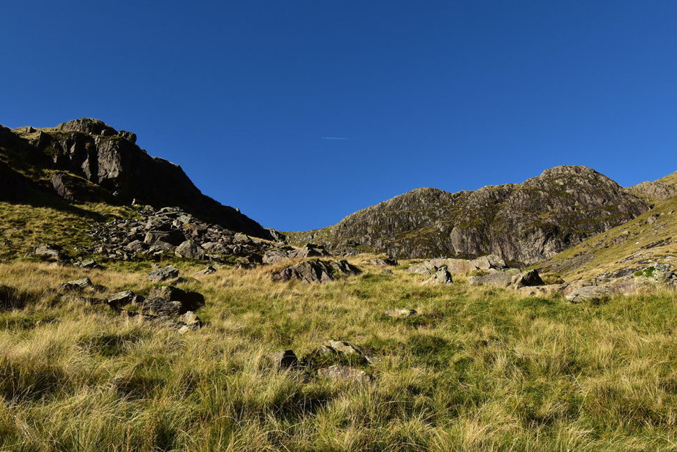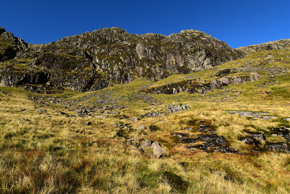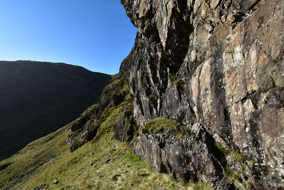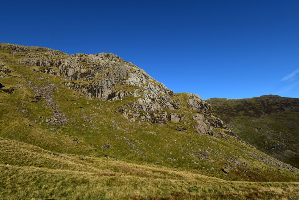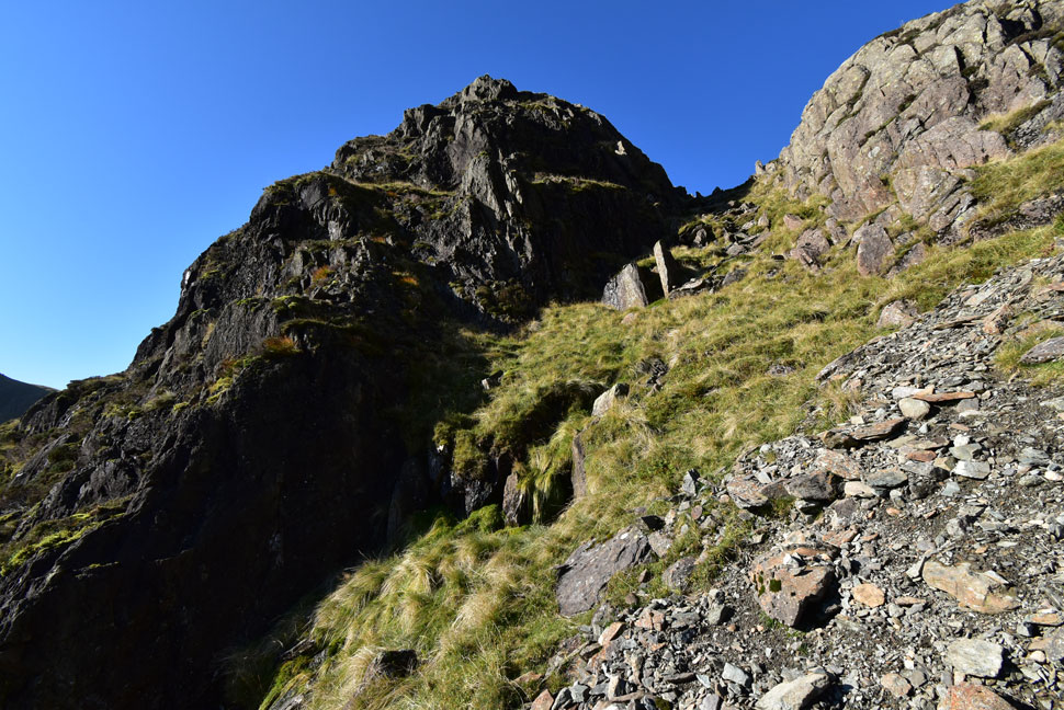 After a quick breather I continue towards the scree seen ahead before picking up the grassy terrace path beyond. |