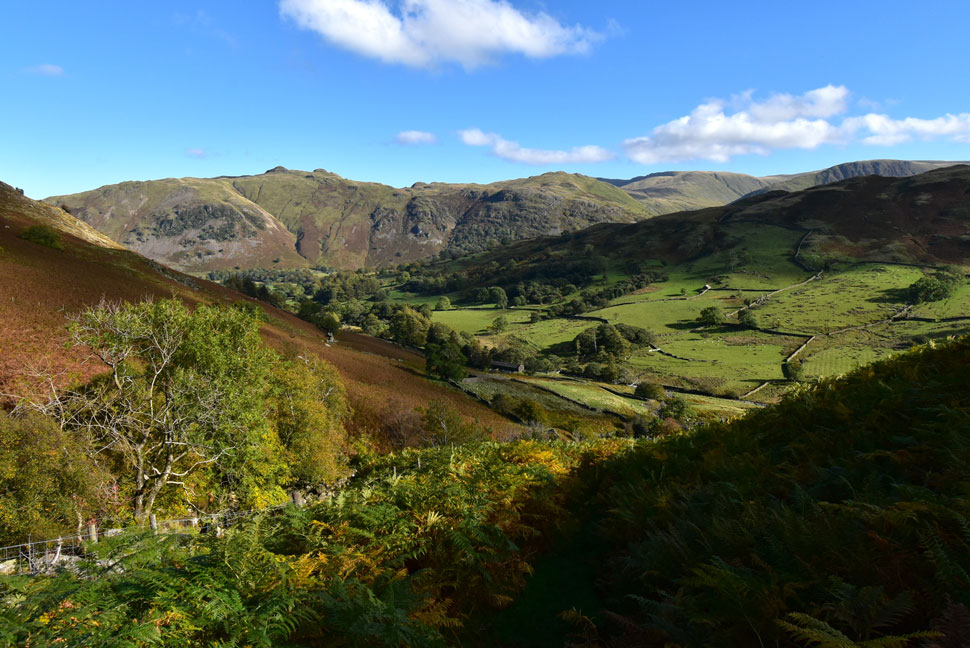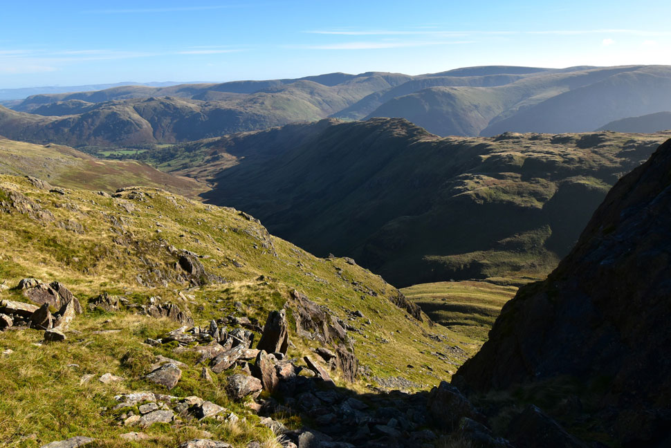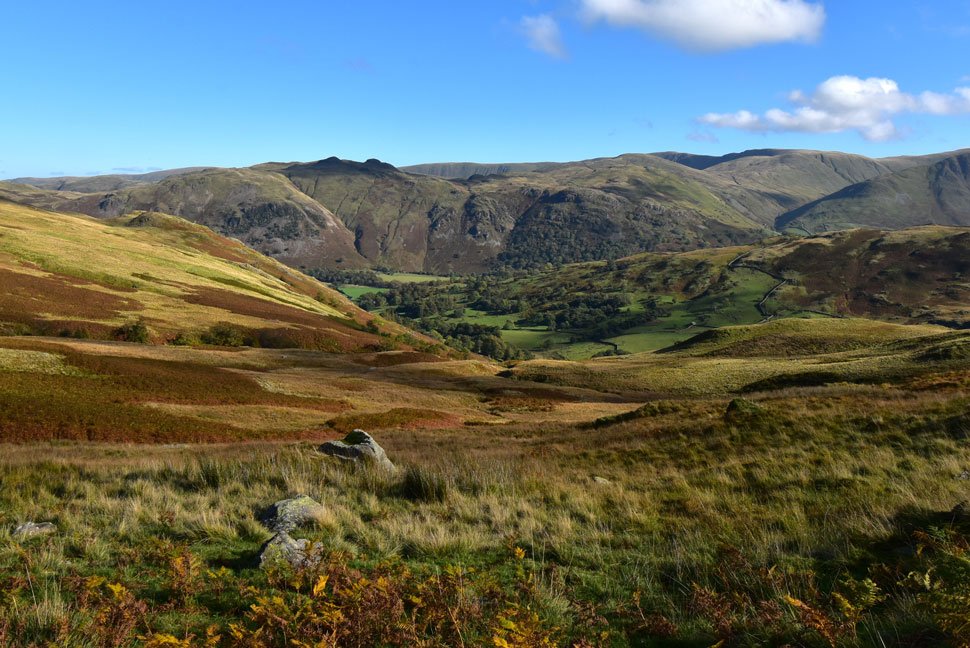 Looking down on the Deepdale valley with views towards Gavel Pike, Place Fell and Angletarn Pikes. |