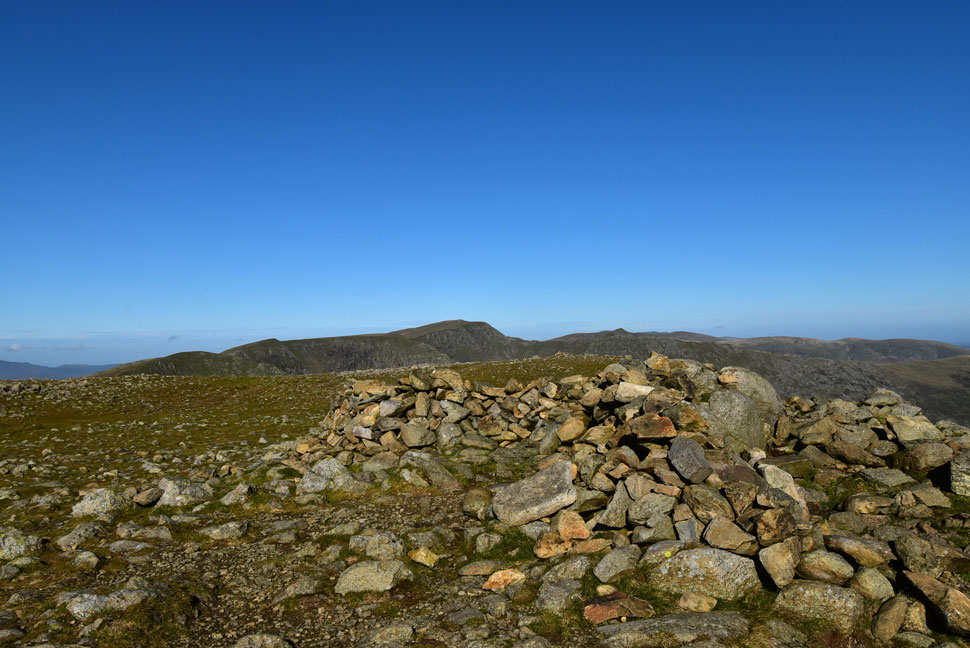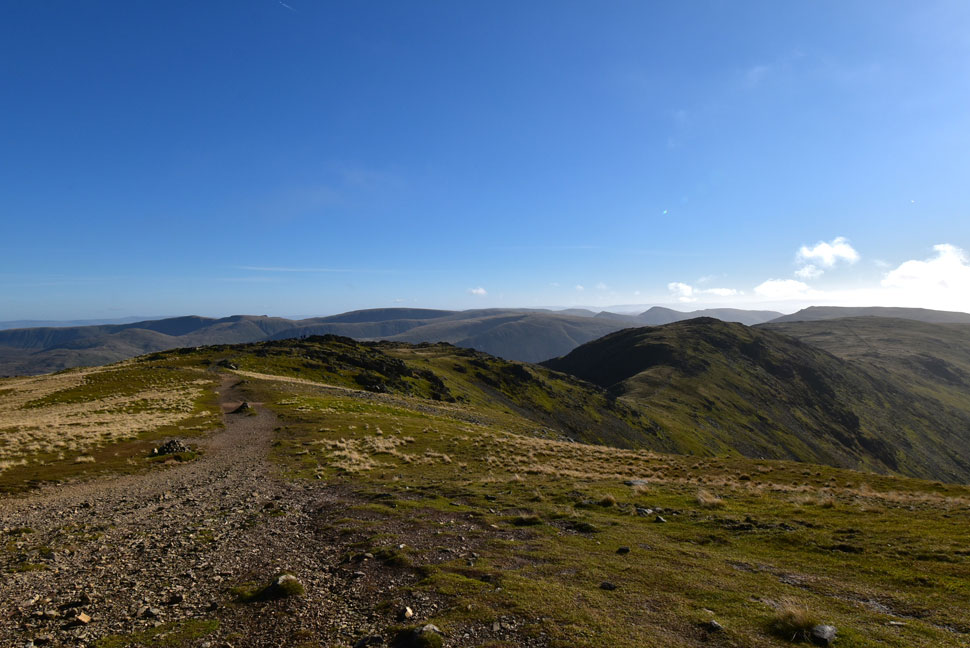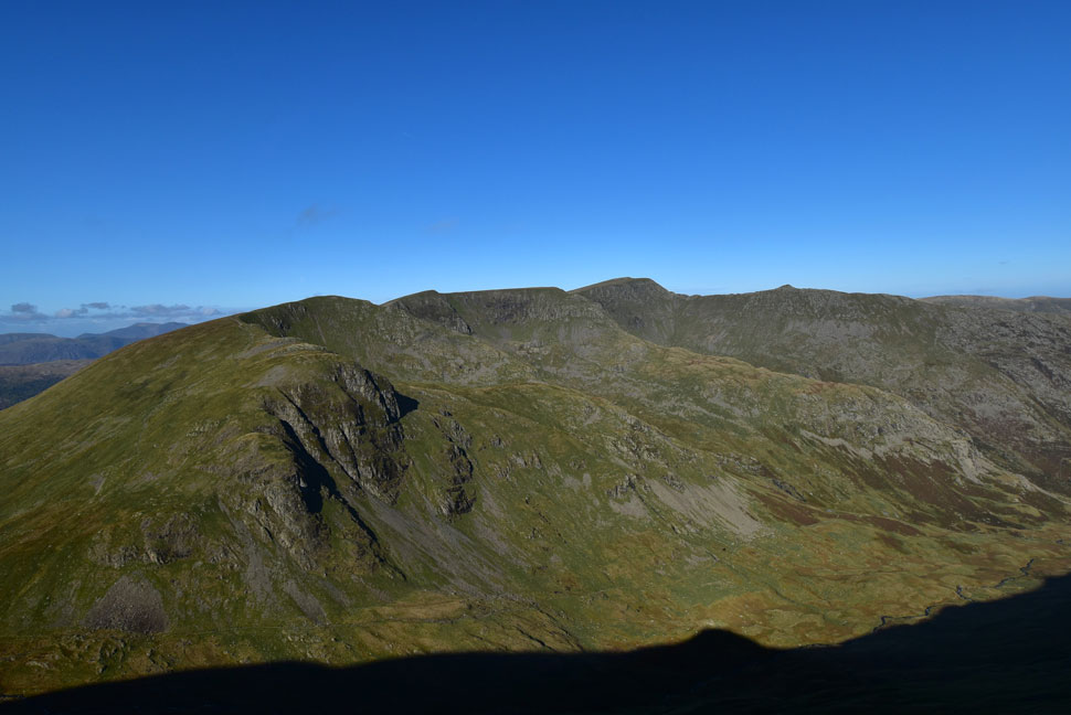 Dollywagon Pike, High Crag, Nethermost Pike, Helvellyn, Striding Edge and Catstye Cam from Fairfield summit. |
