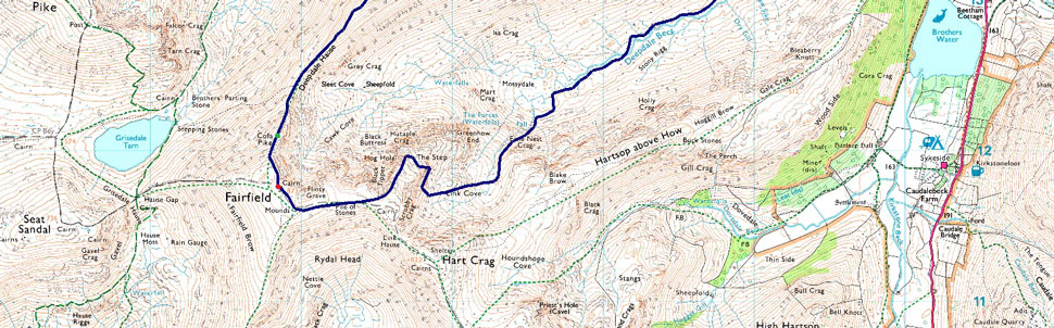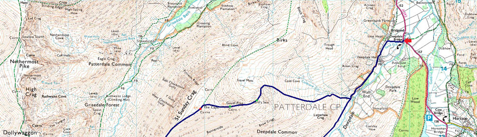 Deepdale Bridge – Wallend – Deepdale – Mossydale – Link Cove – The Step – Link Hause - Fairfield – Cofa Pike – Deepdale Hause - St Sunday Crag - Gavel Pike - Lord's Seat - Coldcove Gill - Deepdale - Deepdale Bridge |