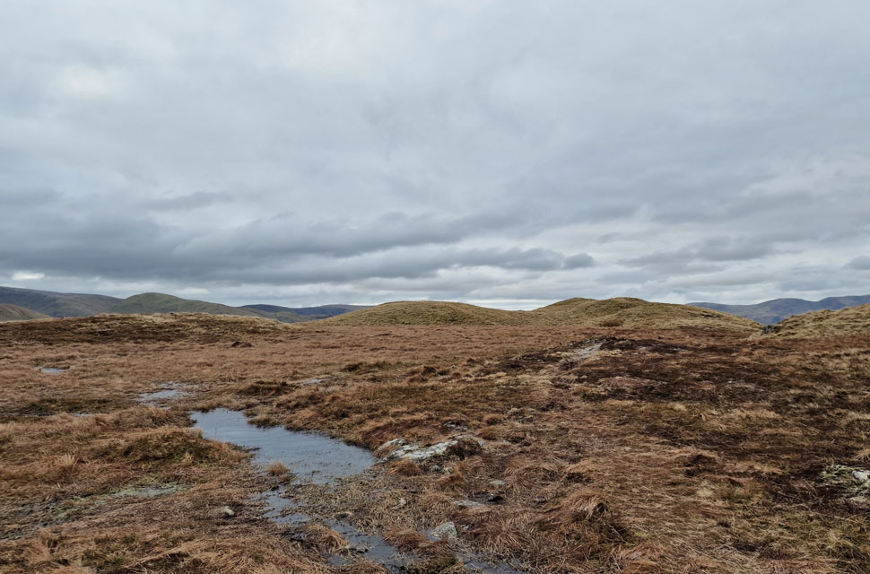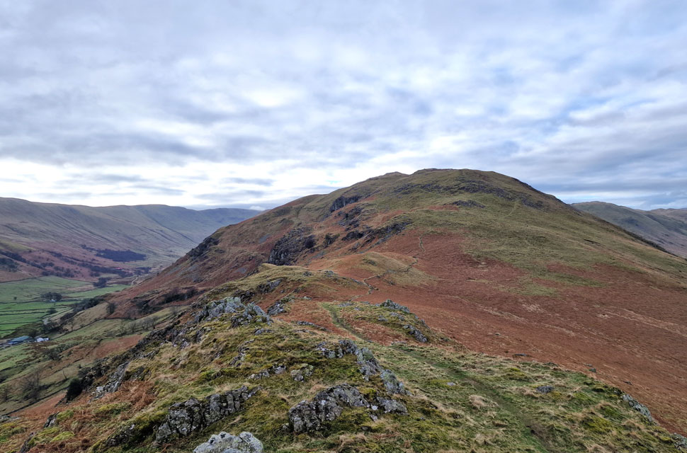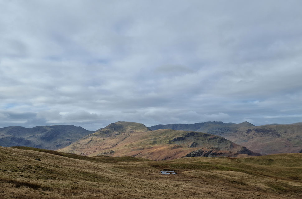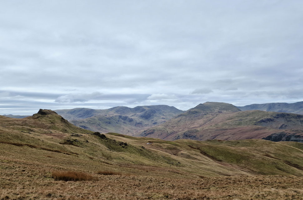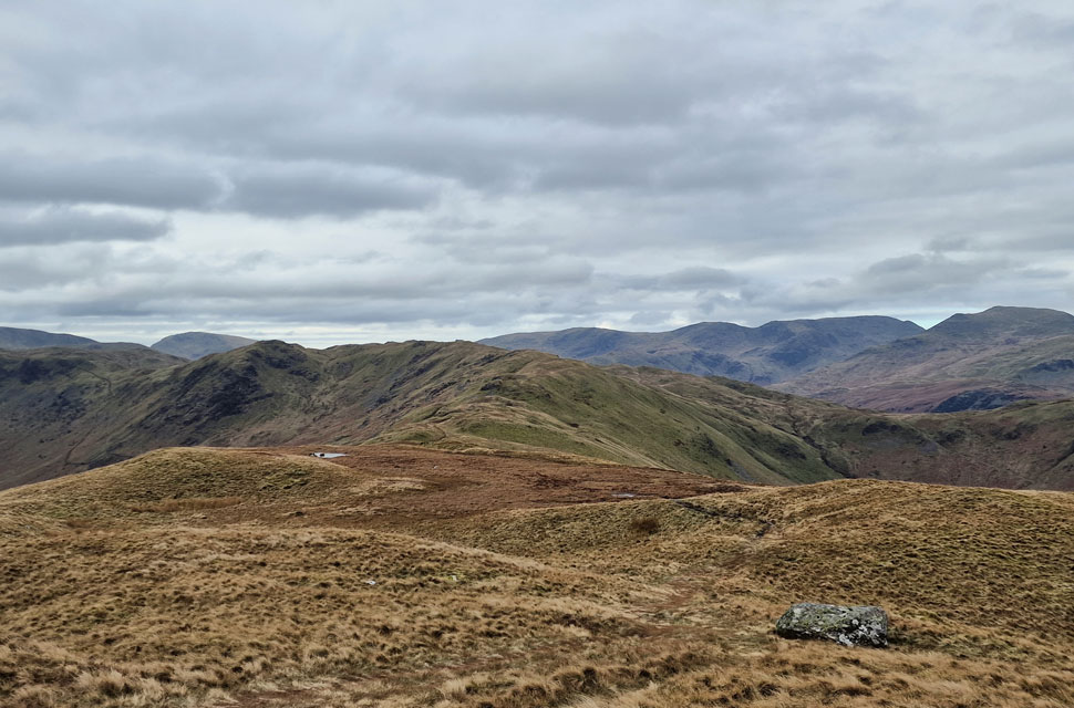 Angletarn Pikes North summit comes into view with Dove Crag, Hart Crag, St Sunday Crag, Birks and Dollywagon Pike in the distance. |