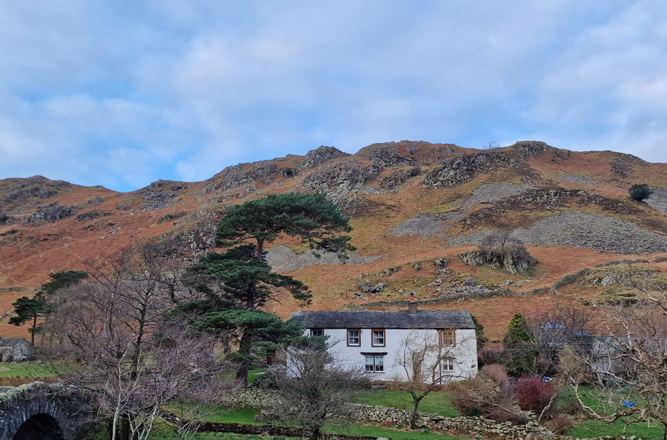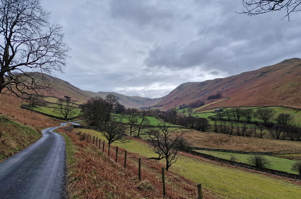 Whilst David and I skirted back through the valley Rod decided that he wanted to ascend Howsteadbrow which is the area beyond the stone wall on the left. The ascent would see him gain the lower ridge of Winter Crag before dropping back into Martindale which was a energetic finish to the walk to say the least. David and I walked the quiet lane leaving Boredale behind often as views opened out Over Sandwick towards Ullswater and Gowbarrow Fell. Stepping aside for the odd car we descended towards the bridge over Howgrain Beck where we stopped to see Rod's progress, we couldn't see him. After crossing the bridge we rose steeply passing Googarth Holiday cottage whose small front garden was abundant with snowdrops.